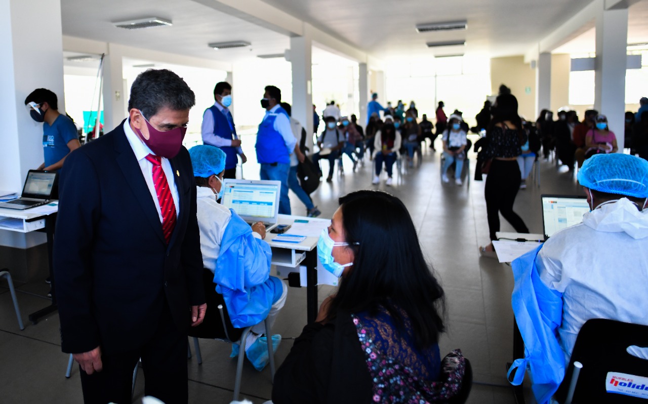 El rector de la Casa Agustina, Dr. Hugo Rojas Flores visitó el vacunatorio ubicado en el segundo piso del comedor universitario de la UNSA (Área de Sociales) para verificar que los procesos se lleven de manera adecuada.