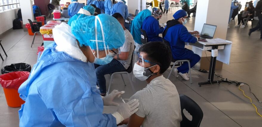 En este punto se instaló el personal de EsSalud para administrar la primera dosis de la vacuna Pfizer. Se espera que en los 4 días de vacunación se alcance a más de 14 mil jóvenes.