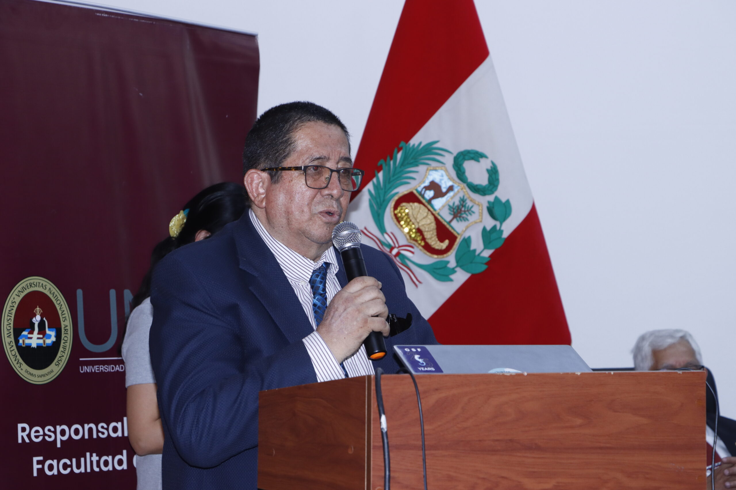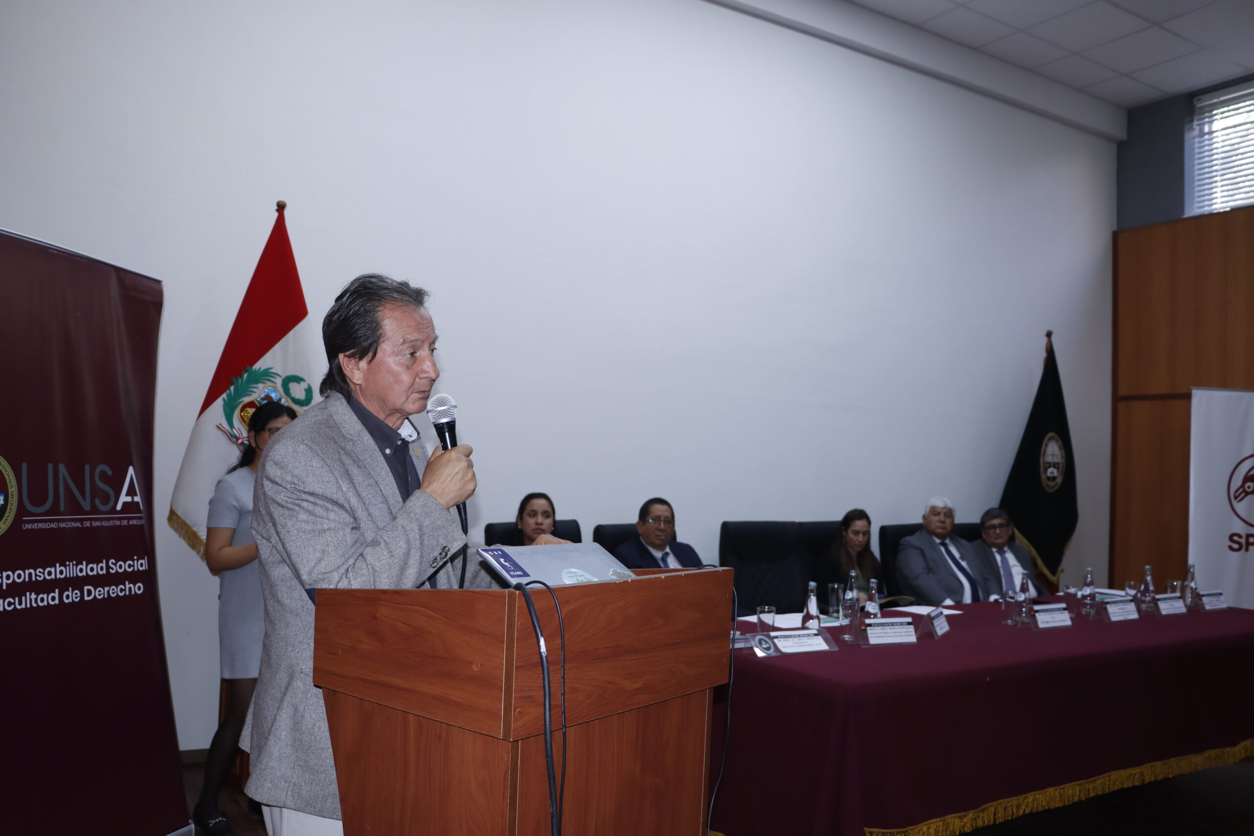 El vicerrector académico de la UNSA, Dr. Luis Ernesto Cuadros Paz, fue el encargado de inaugurar el encuentro y resaltó que el tema ambiental en la educación debe ser transversal, presente en todas las instancias y procesos formativos. Subrayó que cada facultad tiene la responsabilidad de aportar, desde su especialidad, al desarrollo de actividades de protección, recuperación y generación de comportamientos saludables en beneficio de la tierra, la salud de las personas y la naturaleza. En esa línea, destacó que la clínica jurídica ambiental representa un espacio clave para que los futuros abogados asuman un rol activo en la defensa del entorno.
