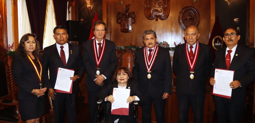 También participaron de la ceremonia el vicerrector académico, Dr. Luis Cuadros Paz; el vicerrector de investigación, Dr. Henry Polanco Cornejo; la secretaria general, Dra. Maritza Chirinos Lazo, junto a decanos de la casa agustina y el personal administrativo del Tribunal.