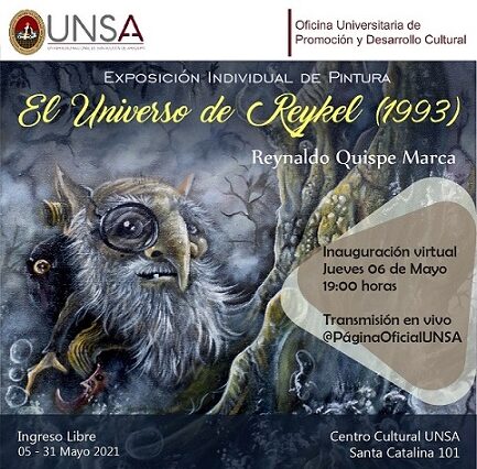 La Exposición Individual de Pintura «El Universo de Reykel (1993)» del artista Reynaldo Quispe Marca, es parte de las exposiciones que viene presentando el Centro Cultural de la UNSA, durante el mes de mayo.