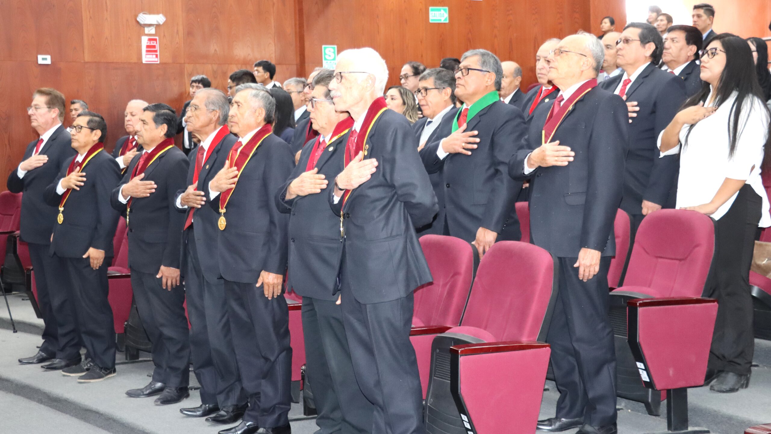 La sesión solemne conmemorativa fue presidida por el rector, Dr. Hugo José Rojas Flores, acompañado del decano Dr. Juan Luna Carpio, el vicerrector académico Dr. Luis Cuadros Paz, el Vicerrector de Investigación Dr. Henry Polanco Cornejo, y la secretaria general Dra. Ruth Maritza Chirinos Lazo, así como otras autoridades universitarias, docentes, estudiantes, personal administrativo e invitados especiales.