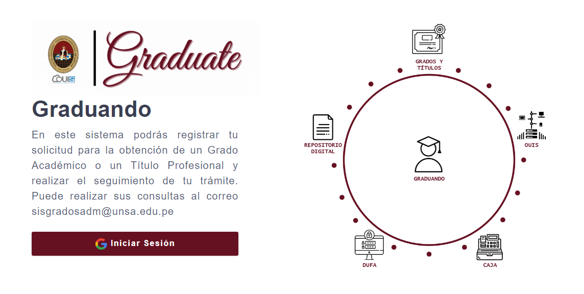 La Facultad de Ciencias Biológicas de la Universidad Nacional de San Agustín de Arequipa, implementó el Sistema de Gestión de Graduación y Titulación SISGRAD/GRADUATE. Mediante esta plataforma los graduandos agustinos tramitarán sus expedientes de manera virtual para la obtención del Grado Académico de Bachiller y Título Profesional y realizar el seguimiento de su trámite en tiempo real.
