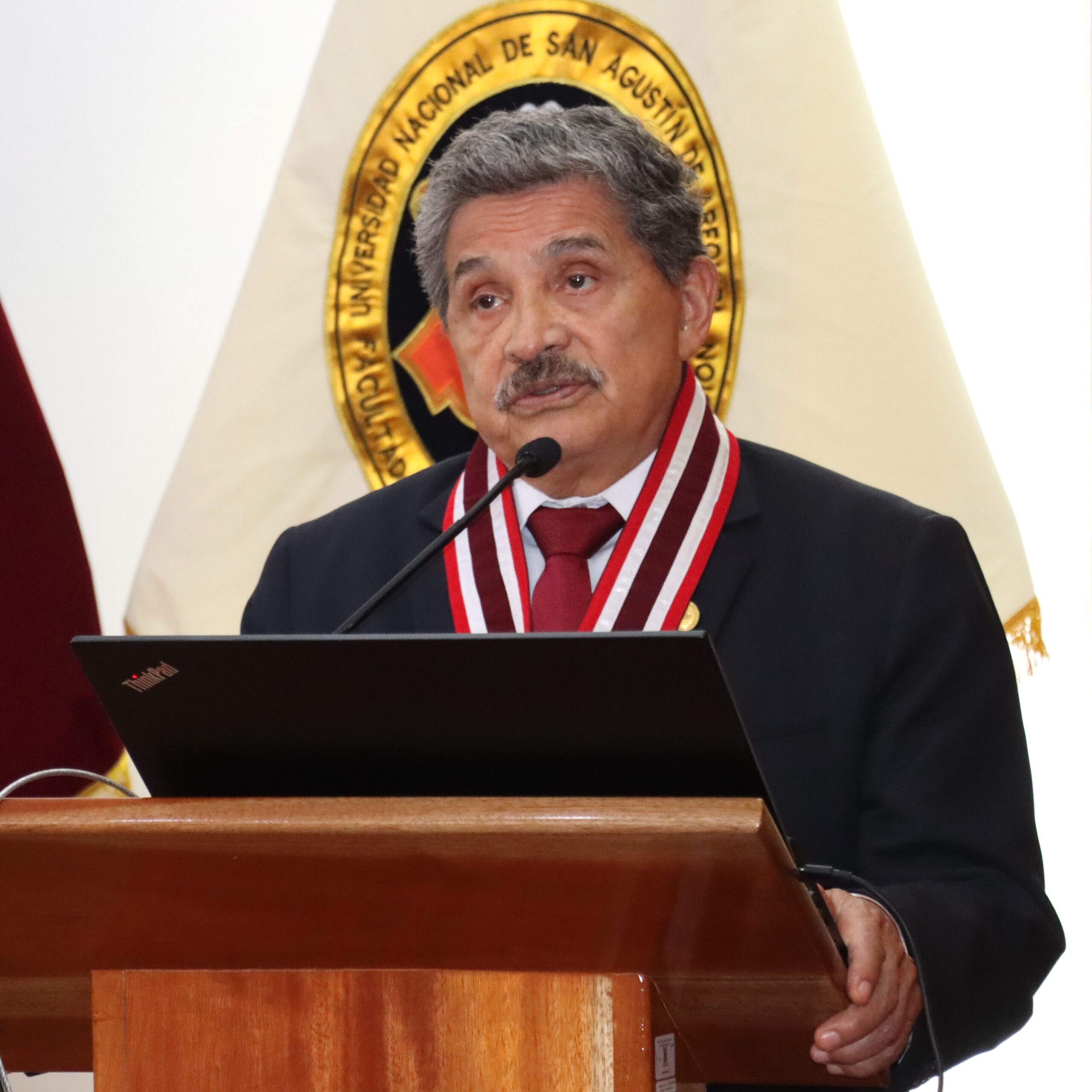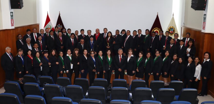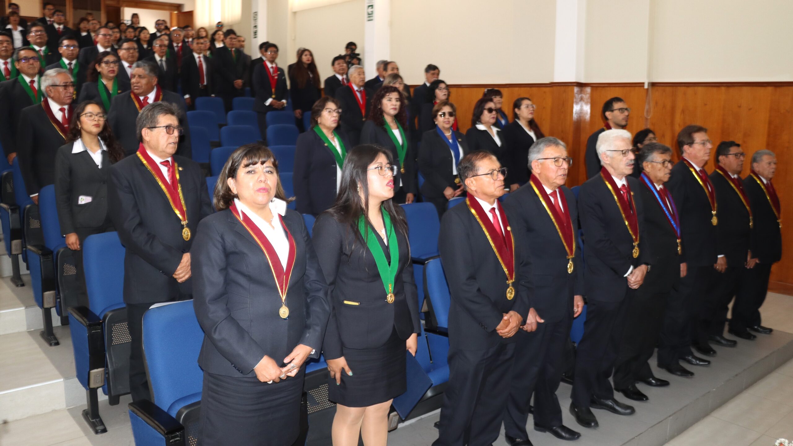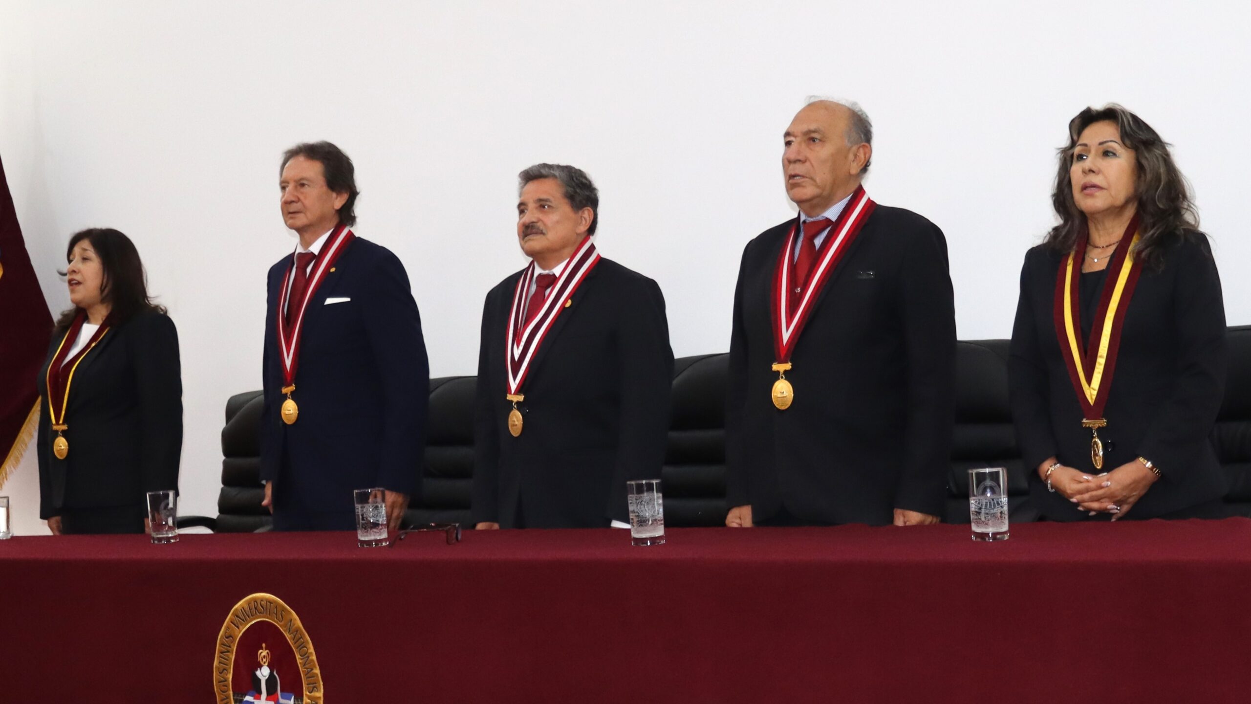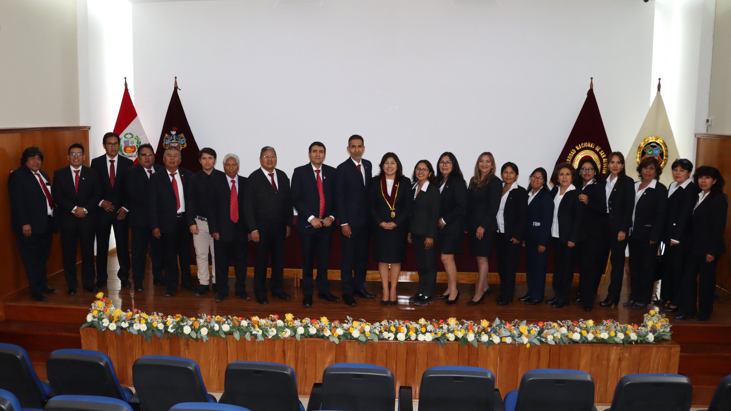 La sesión solemne de aniversario fue presidida por el rector, Dr. Hugo José Rojas Flores, acompañado del Dr. Luis Cuadros Paz, vicerrector académico; del Dr. Henry Polanco Cornejo, vicerrector de investigación; de la Dra. Rut Maritza Chirinos Lazo, secretaria general; de la Dra. Betsy Cisneros Chávez, decana; así como otros decanos, autoridades de la facultad, personal docente y administrativo, estudiantes e invitados.