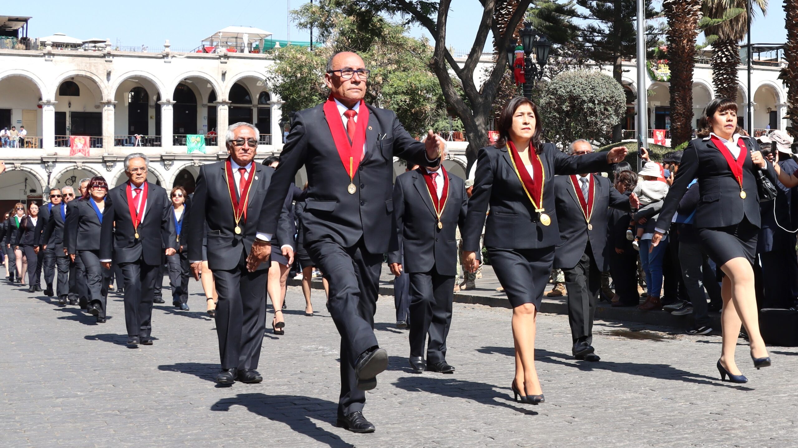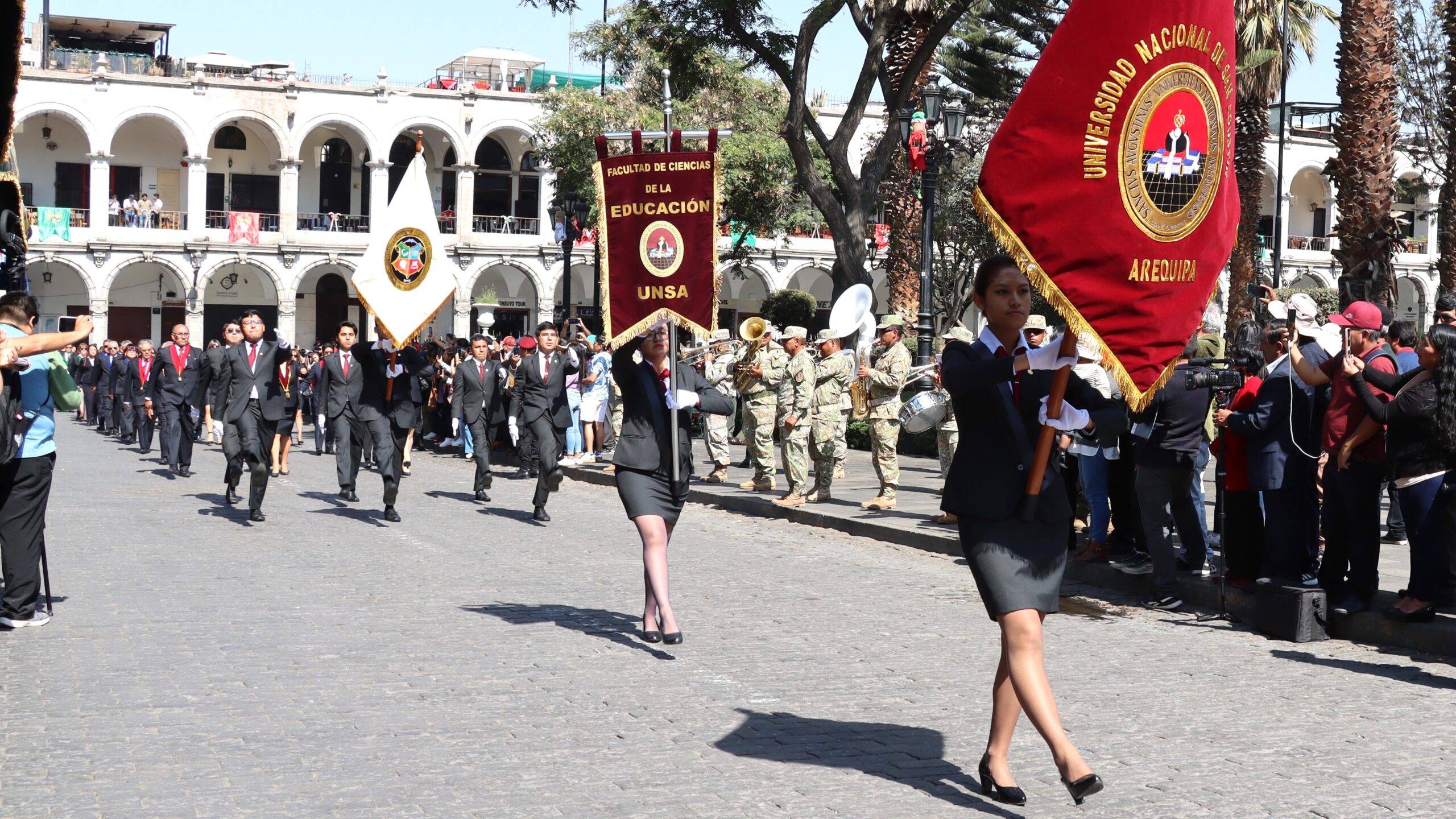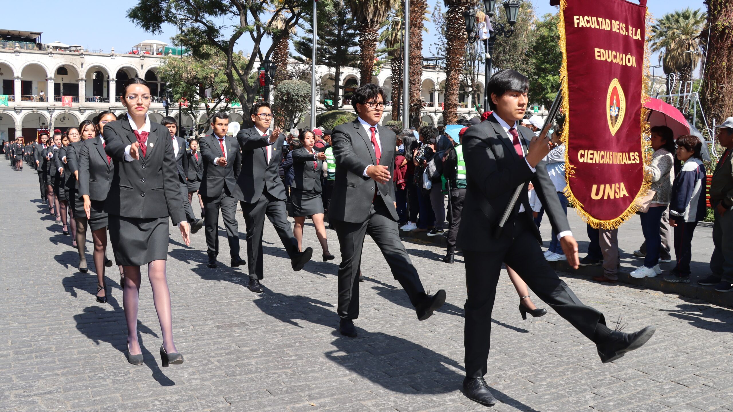 Como parte de las actividades conmemorativas del aniversario, la comunidad participó en la ceremonia dominical del izamiento de las banderas en la Plaza de Armas de Arequipa. En esta ceremonia, la decana Dra. Betsy Cisneros, acompañada del Dr. Luis Cuadros, tuvo el honor de izar el Pabellón Nacional, y posteriormente participó en el desfile de honor que recorrió el perímetro de la plaza, con la participación de las nueve especialidades.
