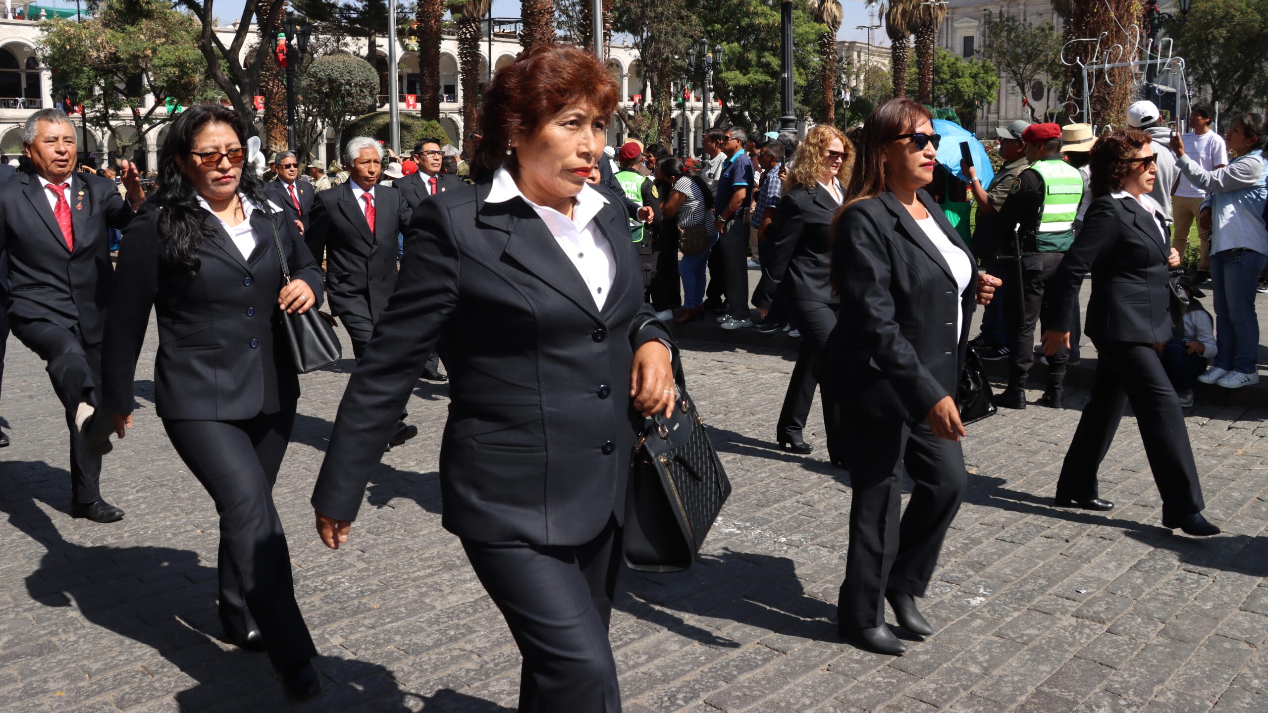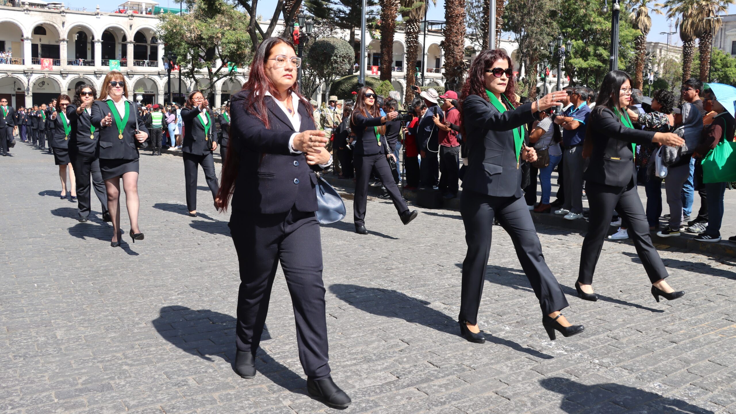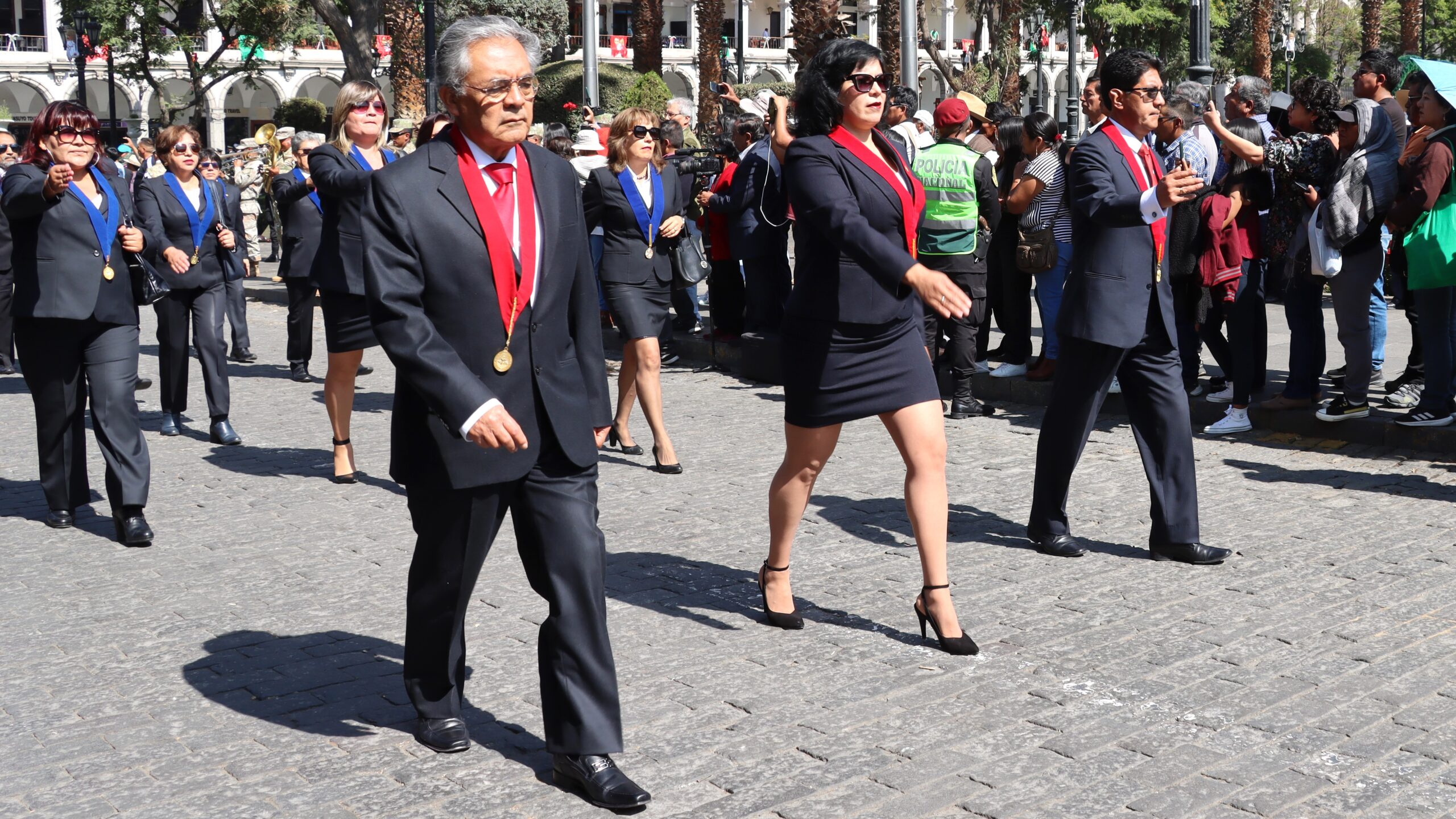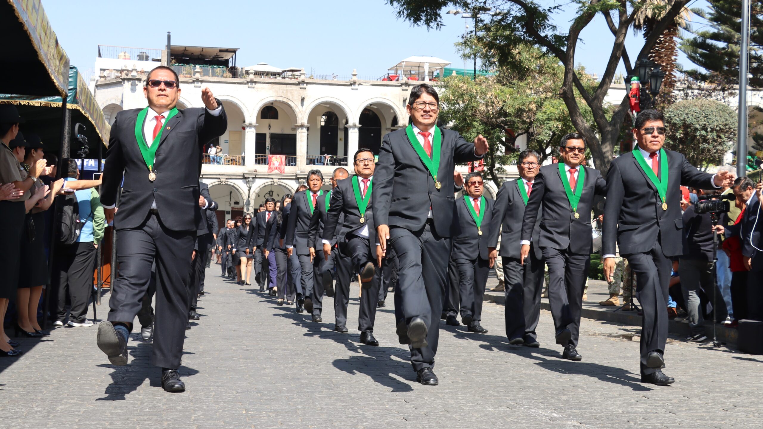 Como parte de las actividades conmemorativas del aniversario, la comunidad participó en la ceremonia dominical del izamiento de las banderas en la Plaza de Armas de Arequipa. En esta ceremonia, la decana Dra. Betsy Cisneros, acompañada del Dr. Luis Cuadros, tuvo el honor de izar el Pabellón Nacional, y posteriormente participó en el desfile de honor que recorrió el perímetro de la plaza, con la participación de las nueve especialidades.