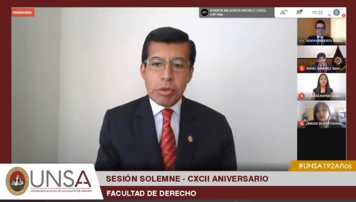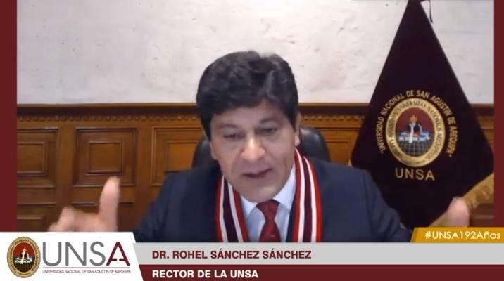 Durante la sesión solemne, llevada a cabo por medios virtuales, el rector de la UNSA, Dr. Rohel Sánchez Sánchez, indicó que la universidad requiere del trabajo de toda la comunidad, para crecer con una mirada global, que no solo se centra en la crisis sanitaria y económica, sino también una crisis política.
