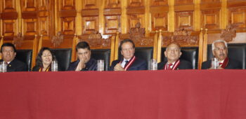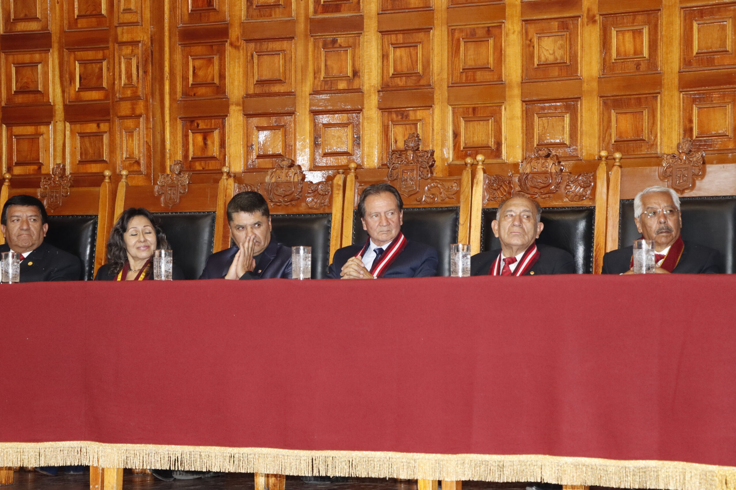 El vicerrector académico Dr. Luis Cuadros Paz, junto al vicerrector de investigación, Dr. Henry Polanco Cornejo y la secretaria general, Dra. Ruth Chirinos Lazo, junto a autoridades de gobierno local y de la facultad en la mesa de honor.
