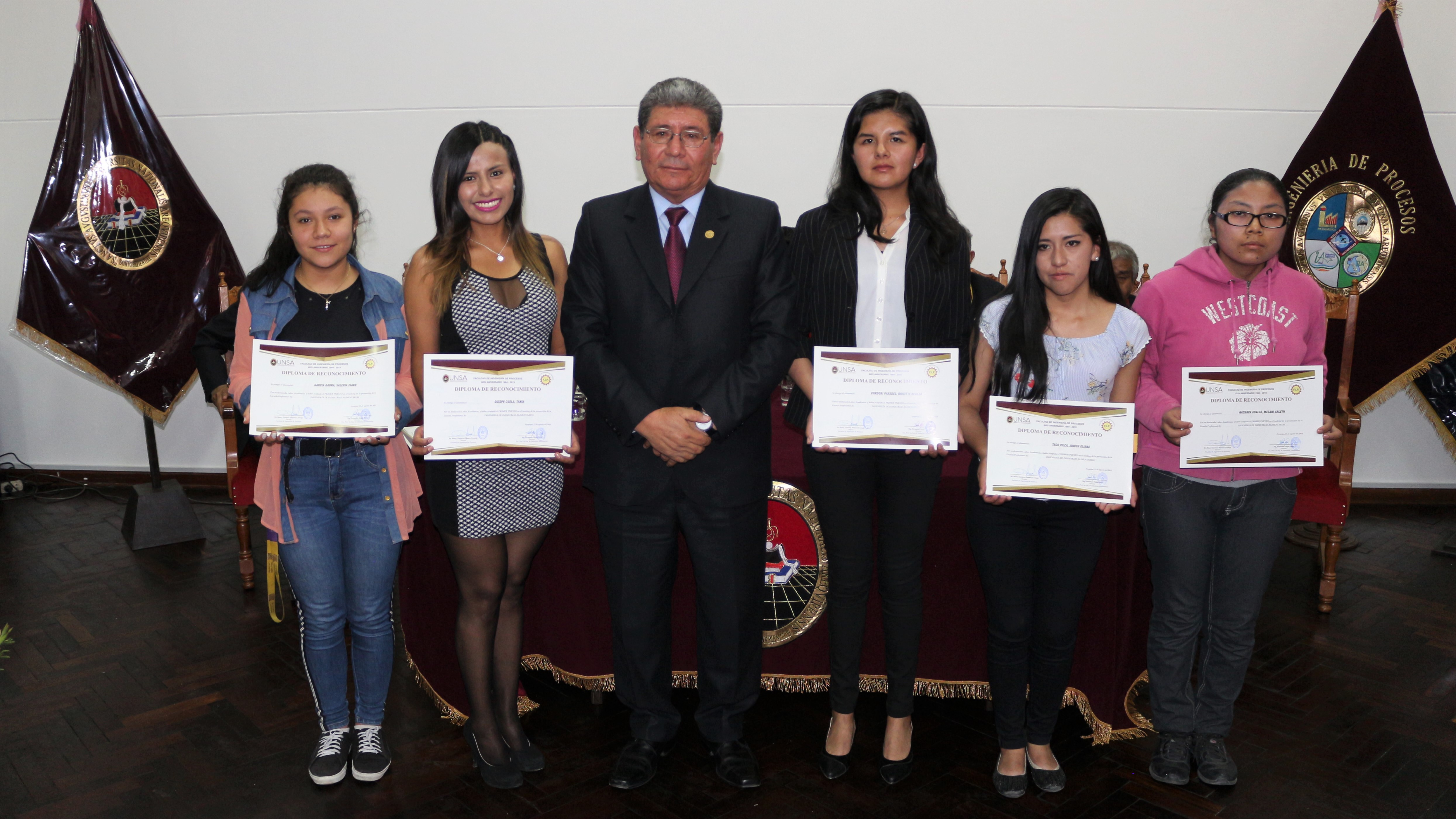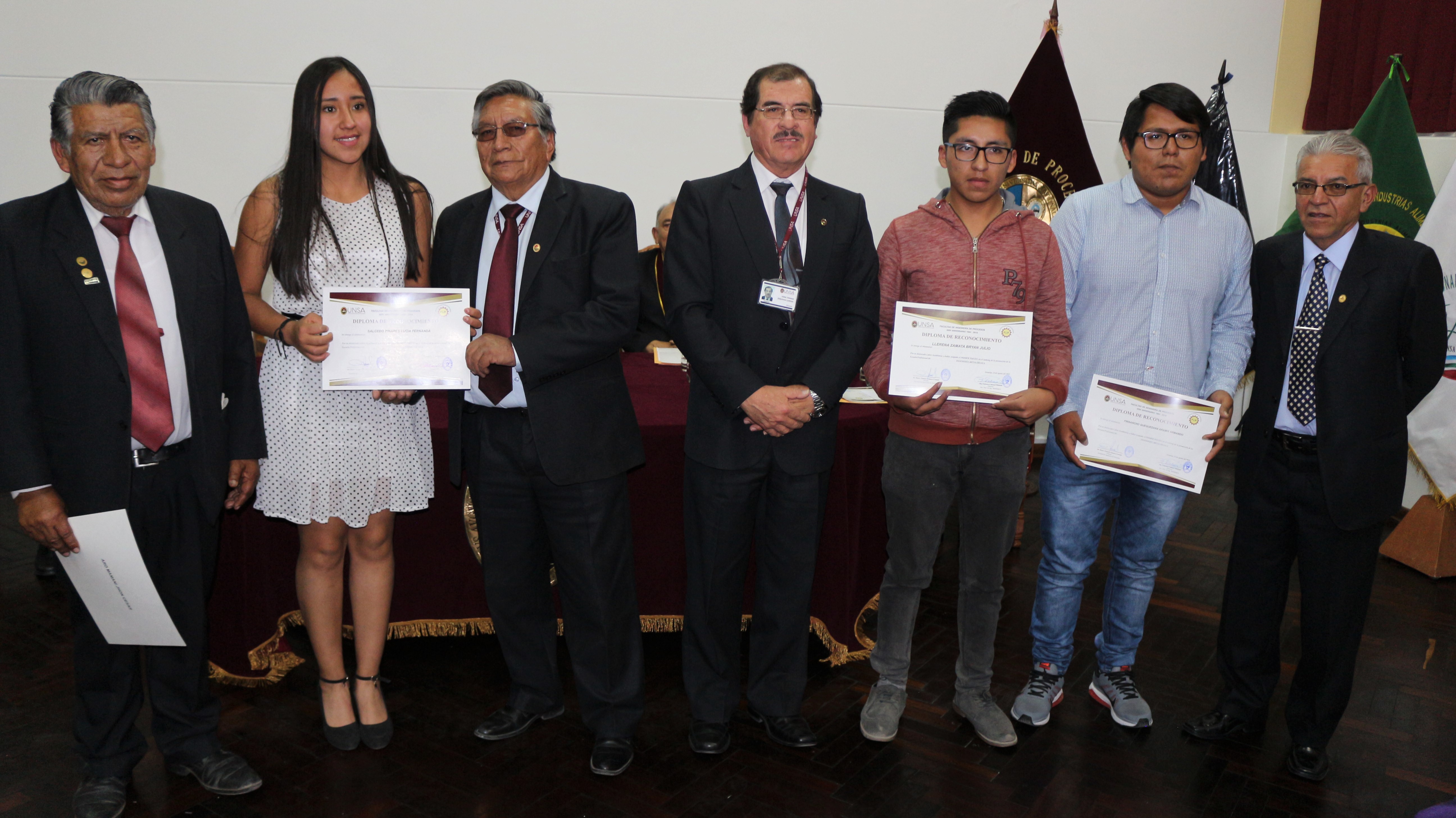 Precisar que en la Sesión Solemne después del mensaje de los directores de las Escuelas Profesionales de Ingeniera Química, Ingeniería Metalúrgica, Ingeniería de Materiales, Ingeniería Ambiental e Ingeniería de Industrias Alimentarias que conforman la Facultad, se entregó reconocimientos a los estudiantes de estos Programas de Estudios que ocupan el primer puesto de cada año académico.