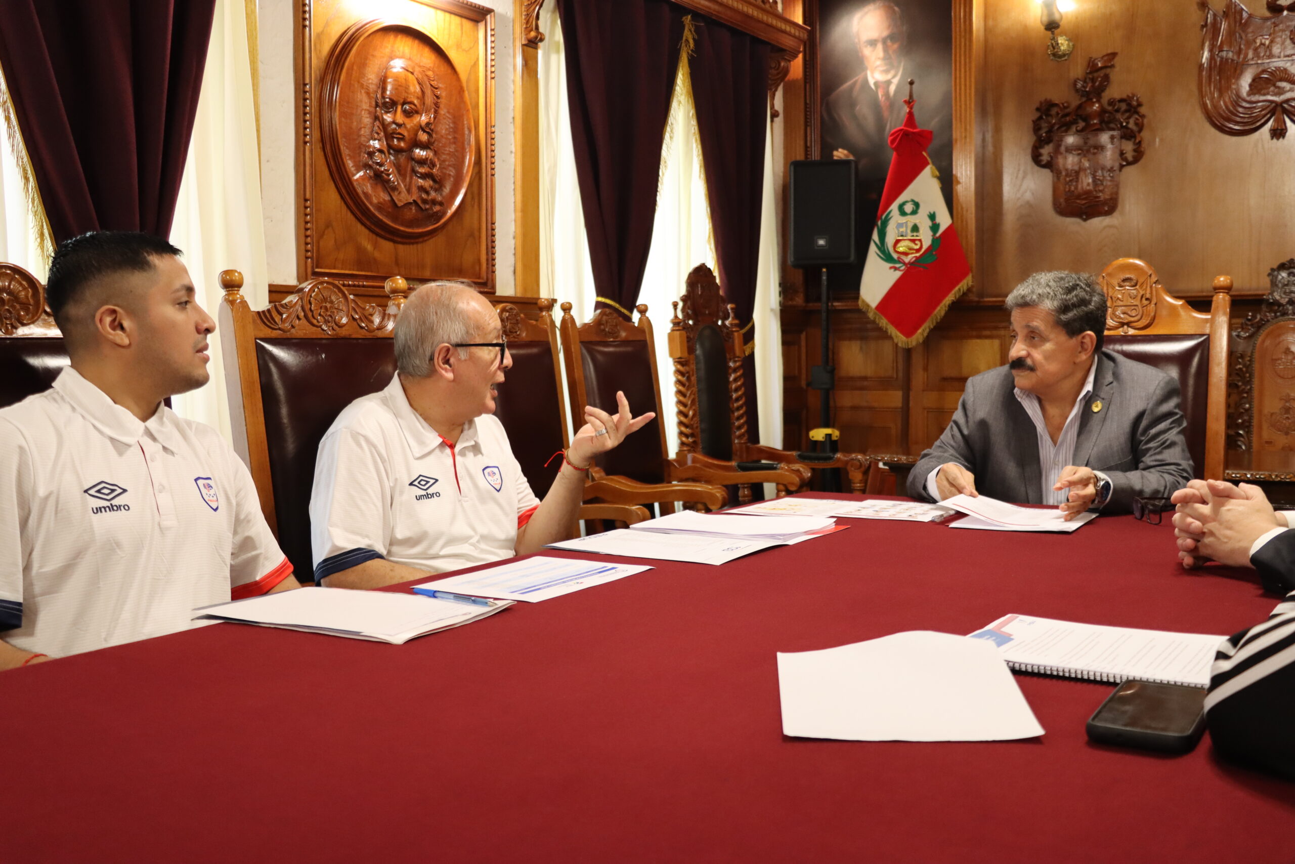 Una comitiva de la FEDUP, dirigida por su gerente deportivo, Ing. Rudy Montero Quispe, se reunió con el rector de la casa agustina, Dr. Hugo Rojas Flores, para ver la participación y el apoyo que brindará la universidad, no solo con sus instalaciones deportivas si no las coordinaciones con otras entidades gubernamentales para ceder escenarios deportivos.