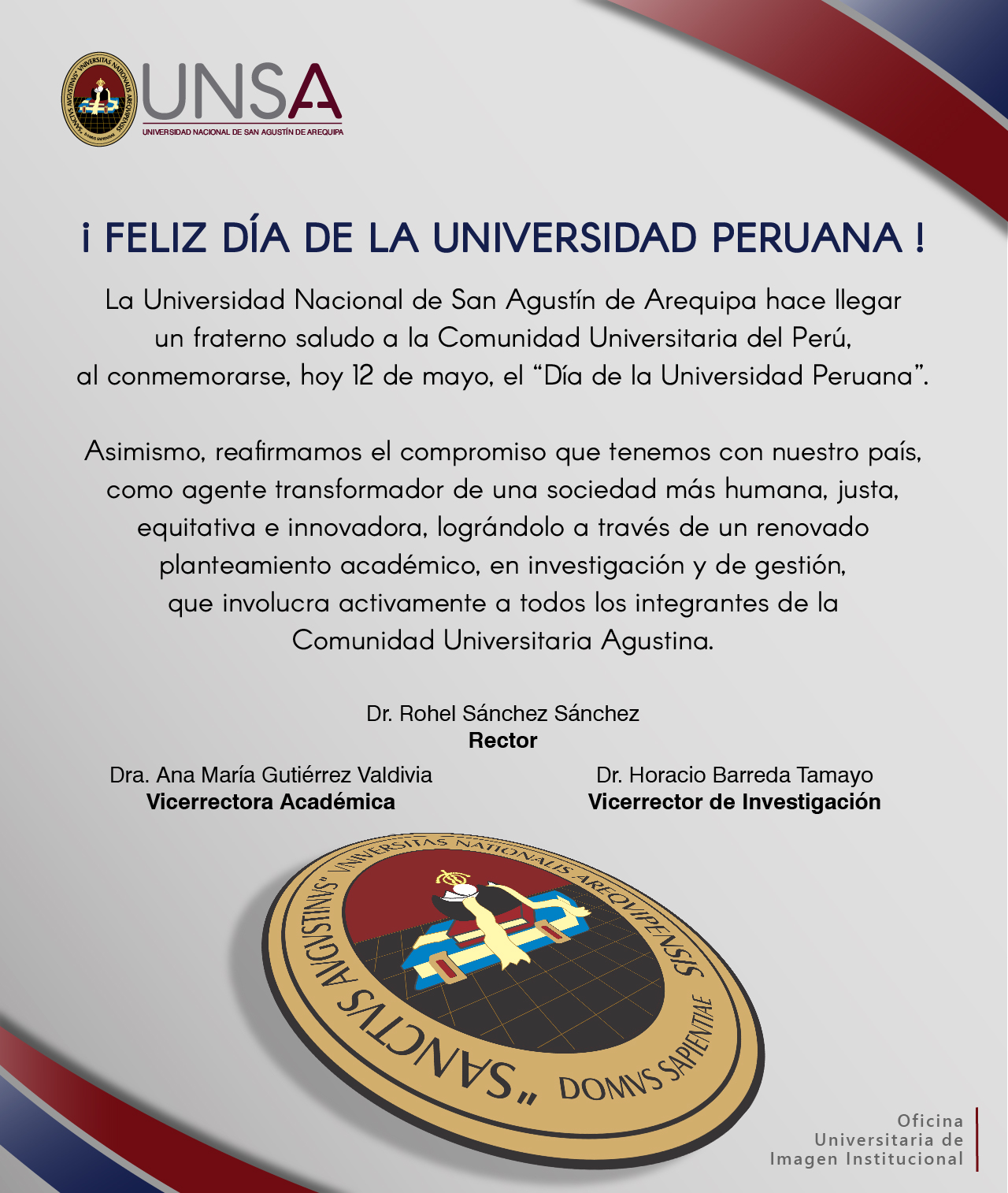 El diá 12 de mayo de cada año, se conmemora a las Universidades Peruanas por la importante labor académica y de innovación que cumplen en nuestra sociedad. La Universidad Nacional de San Agustín de Arequipa, extiende un saludo a todas sus homologas peruanas por su día.