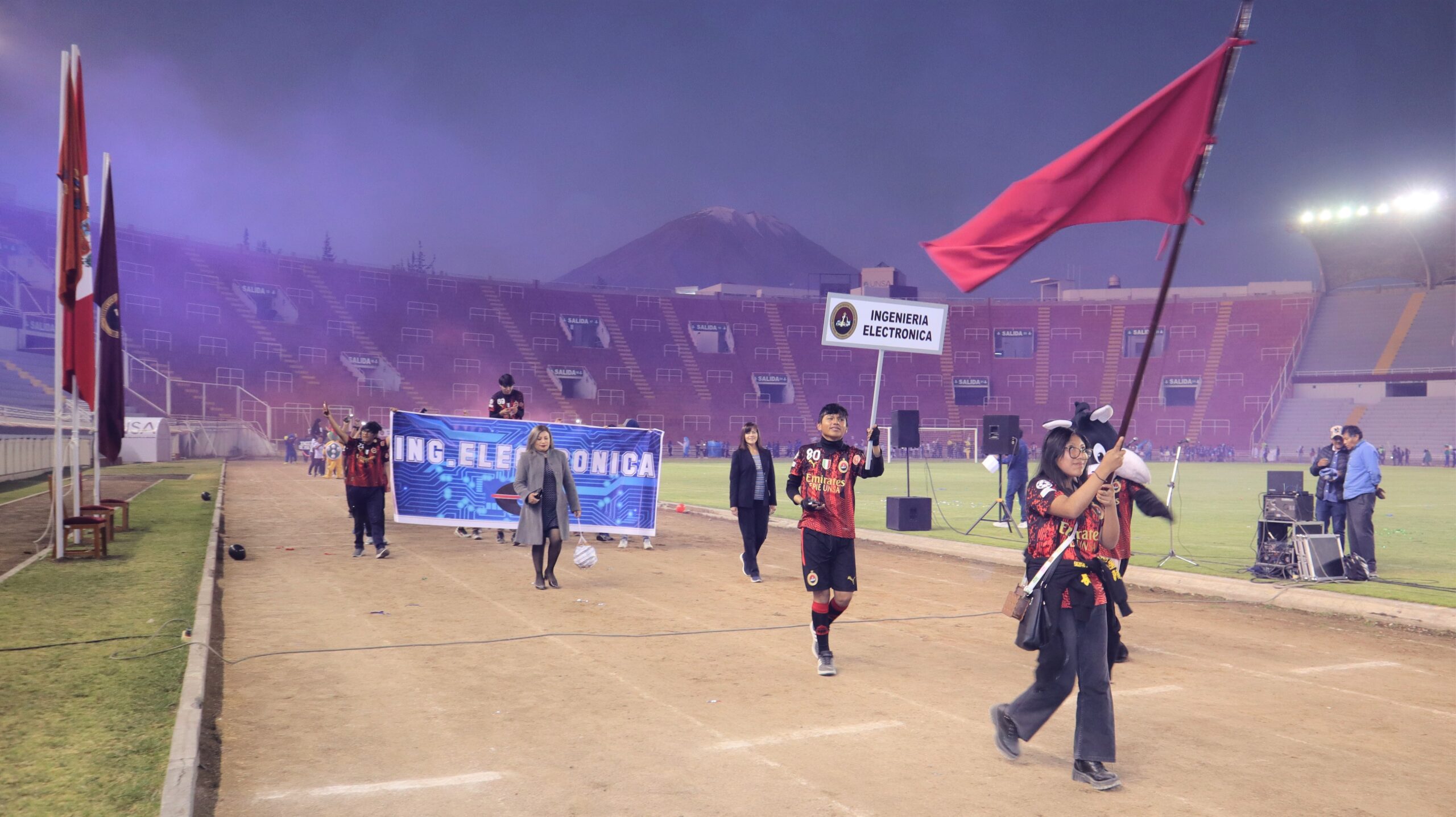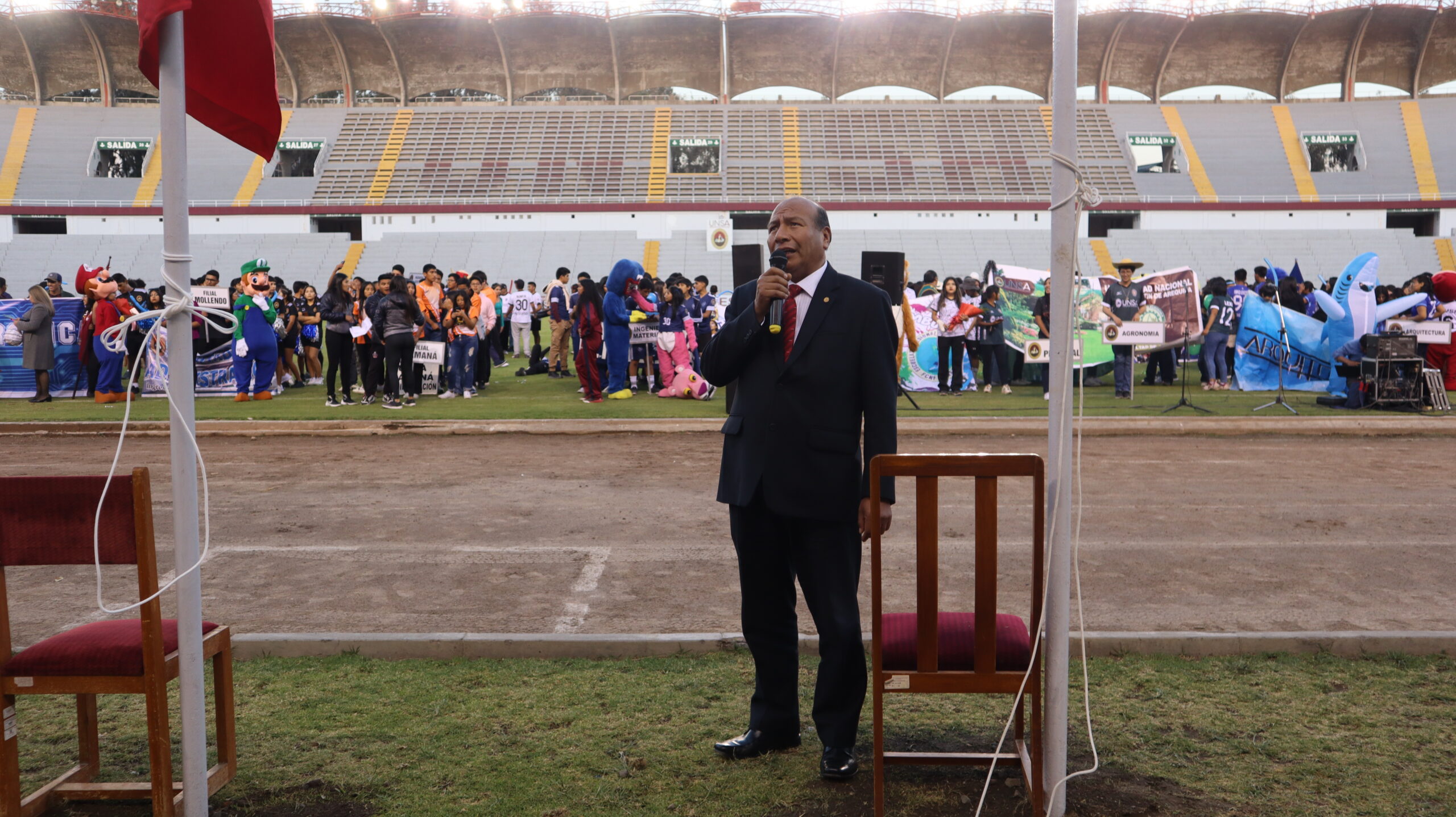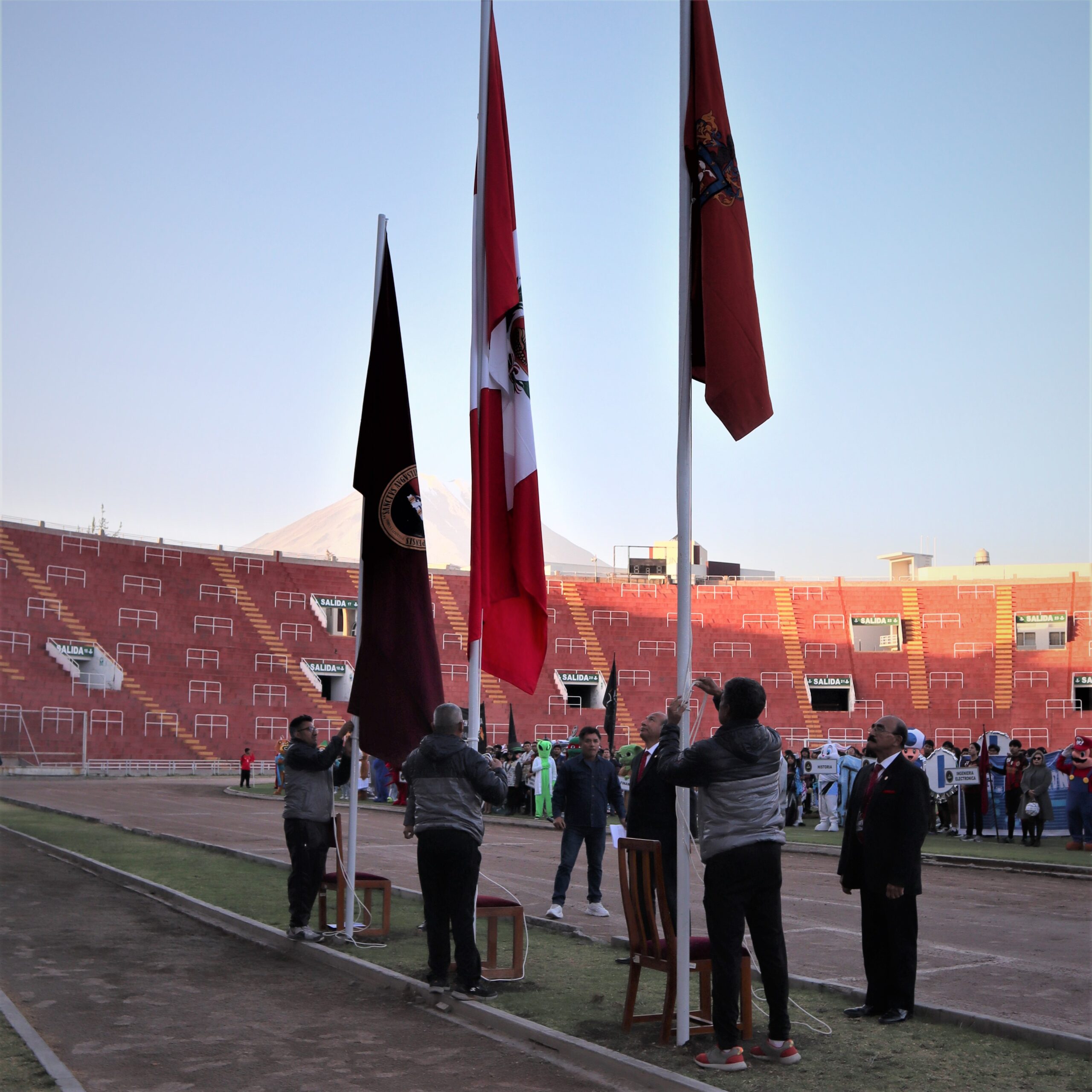 Destacamos que la ceremonia se inició con la bienvenida a cargo del Profesor Pedro Requena del IDUNSA, para luego continuar con el izamiento de Banderas a cargo de autoridades universitarias, el Pabellón Nacional a cargo del Dr. Jesús Hinojosa, la Bandera de Arequipa el Dr. Alejandro Paredes Poblete, jefe de la Oficina de Comunicación e Imagen Institucional y la Bandera de la UNSA a cargo del Mg. Jimmy Díaz Flores, docente de la Facultad de Ciencias Contables y Financieras.