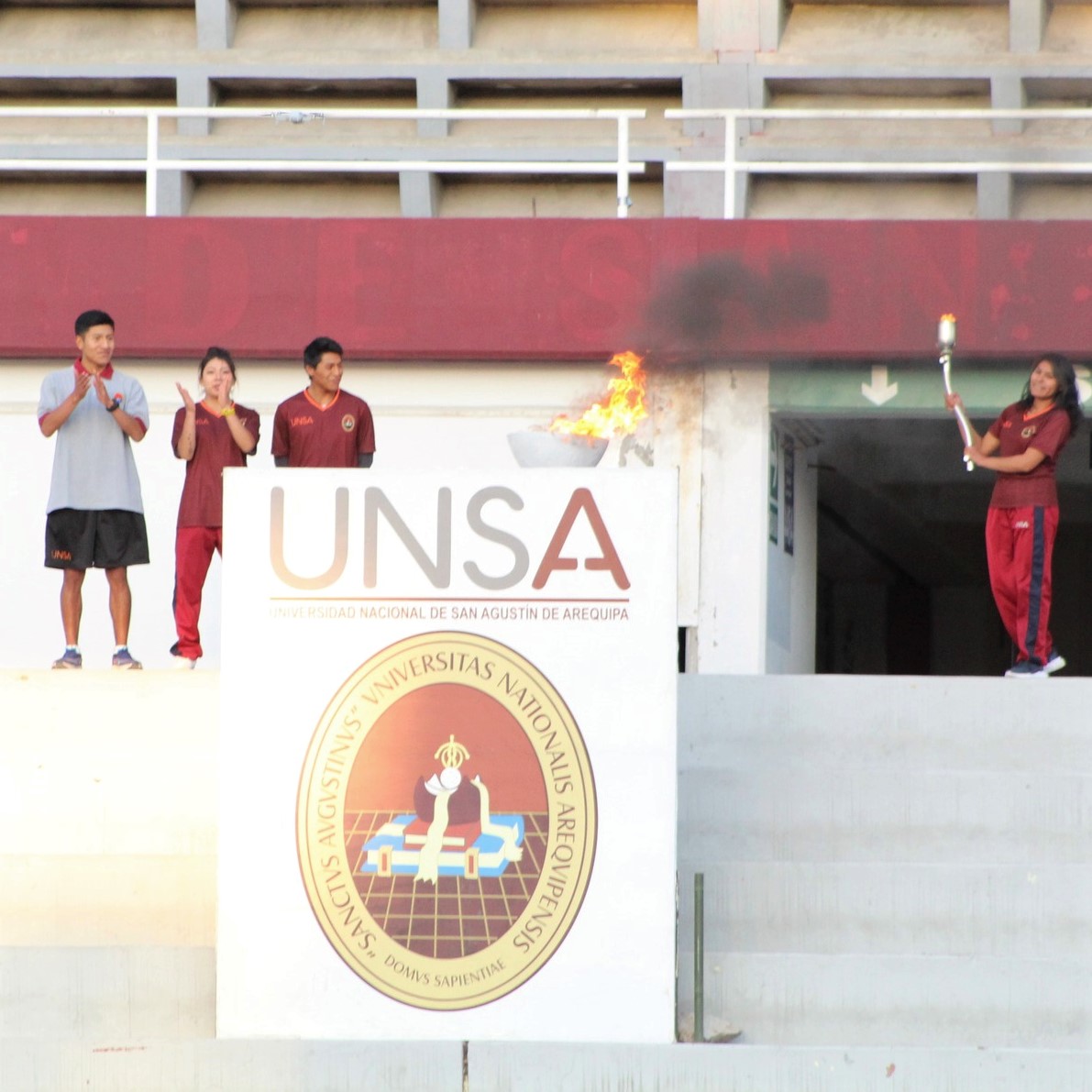 Erika Delgado, Noemí Gaspar y Víctor Arque, llevaron la antorcha olímpica por las inmediaciones del estadio, mientras que Gabriela Mamani, encendió el pebetero en señal del inició de las competiciones.