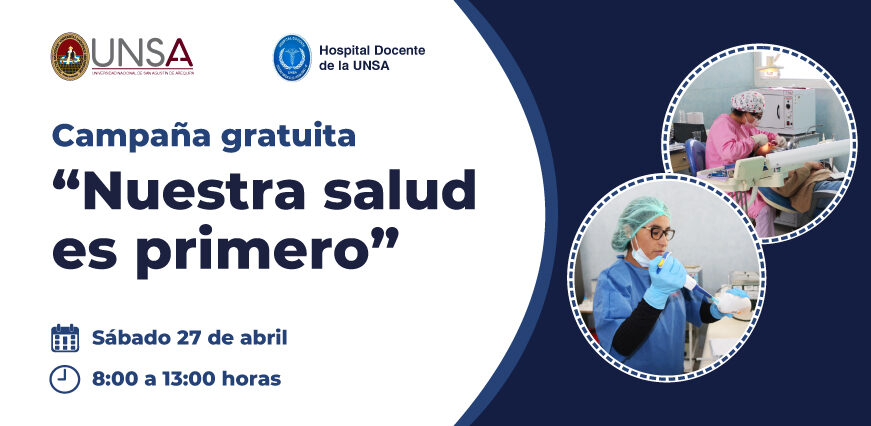 El Hospital Docente de la Universidad Nacional de San Agustín de Arequipa (UNSA), realizará la “Campaña Nuestra Salud es Primero” el próximo sábado 27 de abril de 8:00 a 13:00 horas en su local ubicado en la Av. Aeropuerto 504 del PP. JJ. Víctor Andrés Belaúnde de Cerro Colorado.