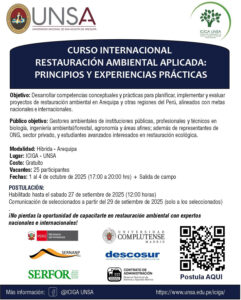 El Instituto de Investigación de Ciencia y Gestión Ambiental de la Universidad Nacional de San Agustín de Arequipa (ICIGA-UNSA) desarrolló el curso “Restauración ambiental aplicada: principios y experiencias prácticas”, realizado del 1 al 4 de octubre de 2025, de participación gratuita. El objetivo central de esta iniciativa fue desarrollar competencias conceptuales y prácticas para planificar, implementar y evaluar proyectos de restauración en Arequipa y otras regiones del Perú, alineando los esfuerzos locales con metas nacionales e internacionales. En esa línea, el curso puso énfasis en promover proyectos medibles y auditables, que permitan optimizar recursos y generar beneficios directos como reducción de erosión, mejora microclimática, conectividad ecológica y espacios más saludables.