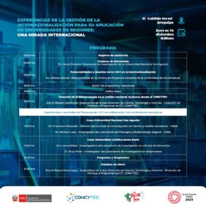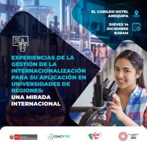 El jueves 14 de diciembre de 2023, en las instalaciones de El Cabildo Hotel Arequipa se llevó a cabo el evento denominado: “EXPERIENCIAS DE LA GESTIÓN INTERNACIONALIZACIÓN PARA SU APLICACIÓN EN UNIVERSIDADES DE REGIONES”, el cual fue organizado por el Consejo Nacional de Ciencia, Tecnología e Innovación Tecnológica – CONCYTEC. En dicho evento se reunieron las distintas universidades arequipeñas, así como representantes de los distintos laboratorios y centros de investigación de las mismas, en el cual expusieron sus experiencias de colaboración internacional en investigación científica.
