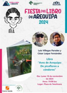 Durante la segunda edición de la Fiesta del Libro de Arequipa, celebrada del 15 al 24 de noviembre de 2024 en la Plaza de Yanahuara en la ciudad de Arequipa, se llevó a cabo la presentación del libro «Aves de Arequipa: De picaflores a cóndores», una obra que resalta la riqueza ornitológica de la región y su importancia para la conservación de la biodiversidad. El evento, organizado por la Municipalidad Provincial de Arequipa, reunió a escritores, investigadores con el propósito de fomentar la cultura, así mismo con la presentación de esta obra incrementar el conocimiento y apreciación sobre los amantes de la naturaleza ambiental y el conocimiento científico a través de la literatura.
