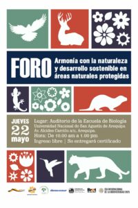 En conmemoración del Día Internacional de la Diversidad Biológica, el jueves 22 de mayo de 2025 se llevó a cabo con gran éxito el foro “Armonía con la naturaleza y el desarrollo sostenible en áreas naturales protegidas”, en el Auditorio de la Escuela Profesional de Biología de la Universidad Nacional de San Agustín de Arequipa (UNSA).