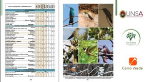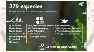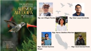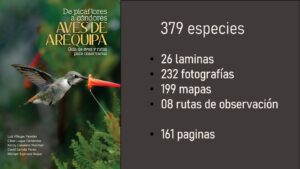 Este libro ofrece un listado actualizado de 379 especies de aves registradas en Arequipa, así como la sugerencia de algunas rutas de observación dentro del departamento de Arequipa y también datos valiosos sobre la distribución y estado actual de estas aves. Convirtiéndose en una herramienta esencial para investigadores, estudiantes, observadores de aves y ciudadanía en general. Entre las especies documentadas destacan desde pequeñas aves como los picaflores hasta majestuosos cóndores andinos, revelando la riqueza de ecosistemas que alberga el territorio arequipeño.