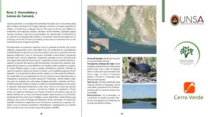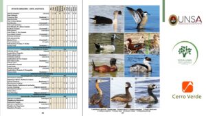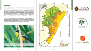 Este libro ofrece un listado actualizado de 379 especies de aves registradas en Arequipa, así como la sugerencia de algunas rutas de observación dentro del departamento de Arequipa y también datos valiosos sobre la distribución y estado actual de estas aves. Convirtiéndose en una herramienta esencial para investigadores, estudiantes, observadores de aves y ciudadanía en general. Entre las especies documentadas destacan desde pequeñas aves como los picaflores hasta majestuosos cóndores andinos, revelando la riqueza de ecosistemas que alberga el territorio arequipeño.