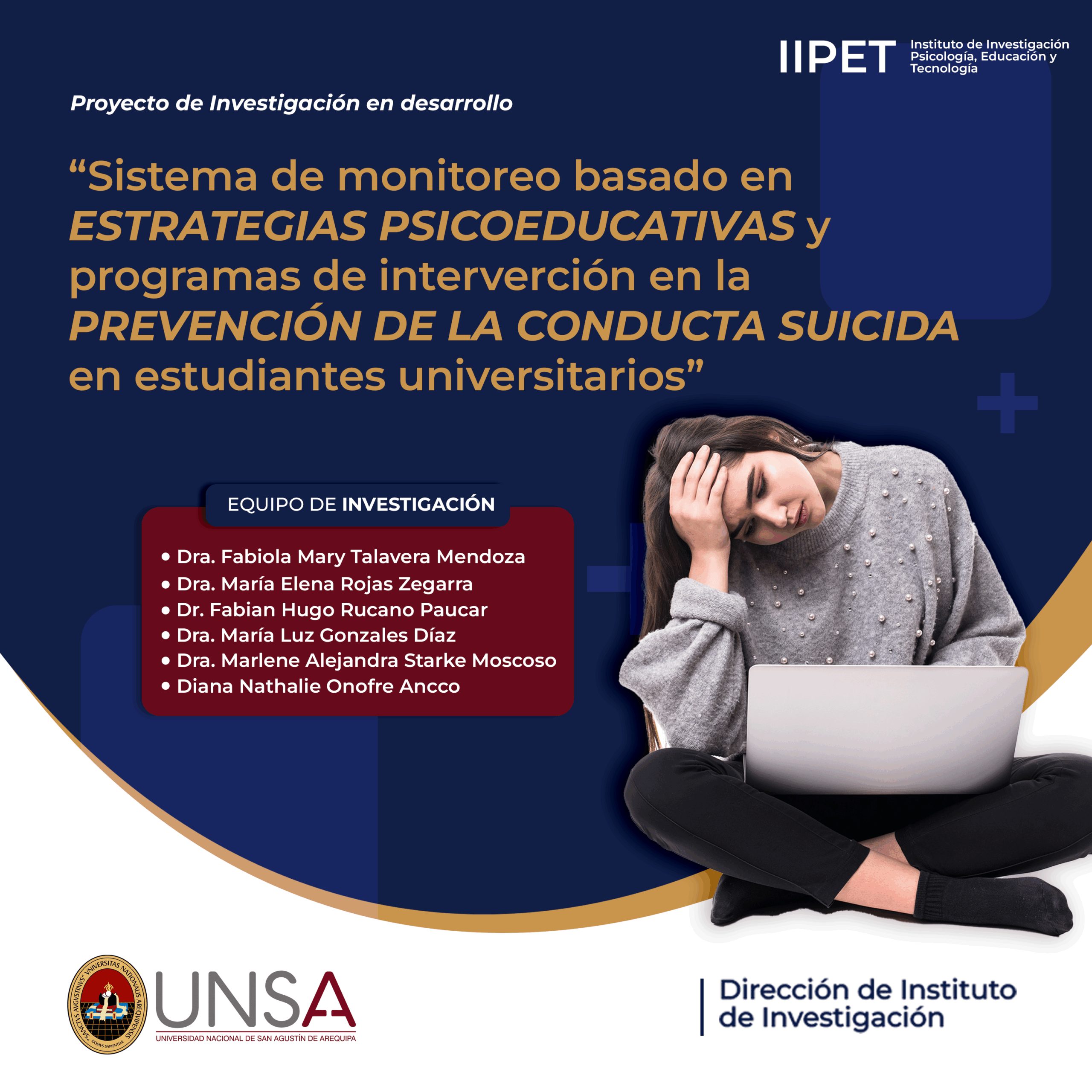 El equipo investigador está liderado por la Dra. Fabiola Mary Talavera Mendoza como investigadora principal, acompañada por las doctoras María Elena Rojas Zegarra, María Luz Gonzales Díaz, Marlene Alejandra Starke Moscoso y el Dr. Fabian Hugo Rucano Paucar, todos de la UNSA, además de Diana Nathalie Onofre Ancco, tesista de pregrado. Se aplicarán estrategias de prevención universal, selectiva e indicada, integradas en un programa de salud mental con uso de tecnologías, buscando generar evidencia para orientar decisiones institucionales y fortalecer redes de apoyo.