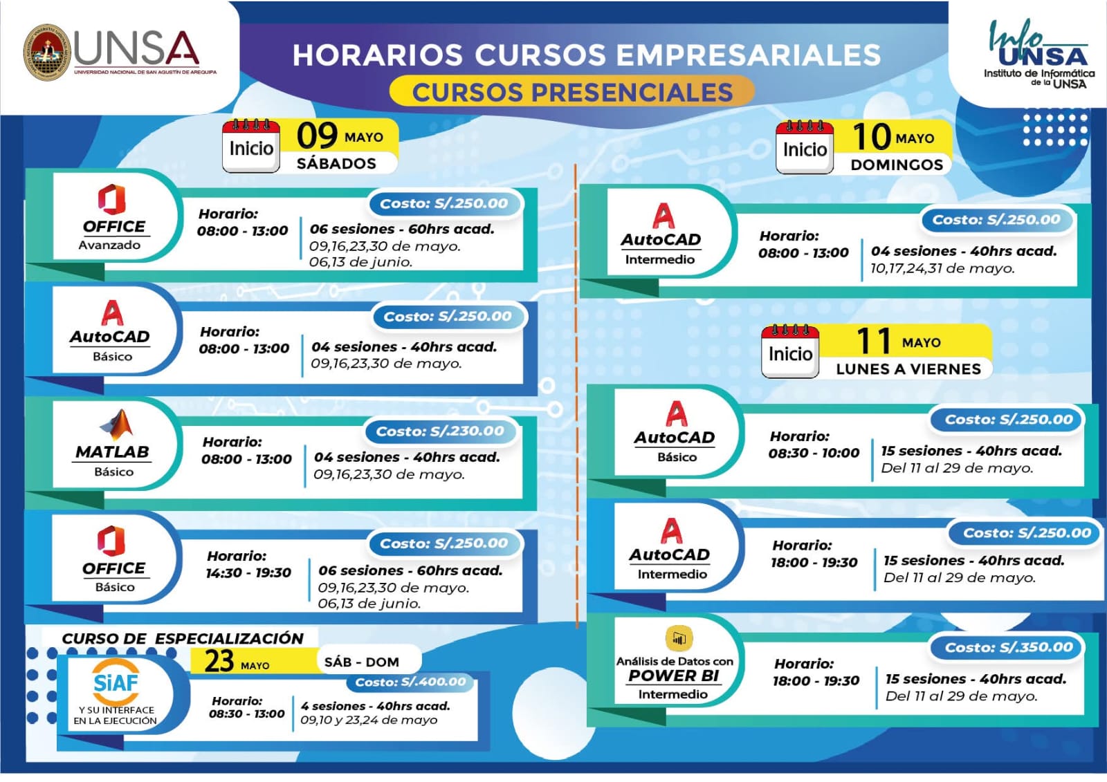 Los cursos, que darán inicio el 9 de mayo, se impartirán tanto en modalidad virtual como presencial, adaptándose a las necesidades y disponibilidad de los participantes. Además, INFOUNSA destaca por ofrecer horarios flexibles, incluyendo opciones de lunes a viernes y fines de semana, facilitando así la conciliación con otras actividades. Cada curso culminará con la entrega de un certificado, avalando la capacitación adquirida.