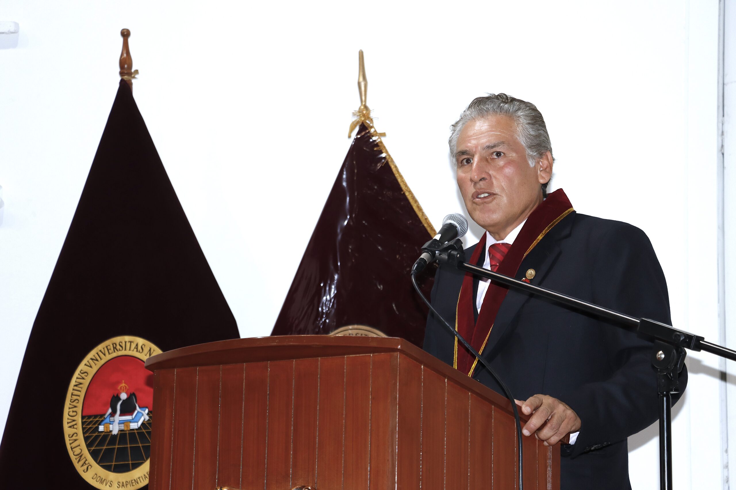 Durante su intervención, el Dr. Enciso subrayó el papel del estudiantado en la vida académica de la facultad, destacando los logros obtenidos este año en el XXXI CONEIC Ucayali 2024, donde la delegación de la UNSA obtuvo el tercer puesto en el cómputo general, además de primeros lugares en otros concursos.
