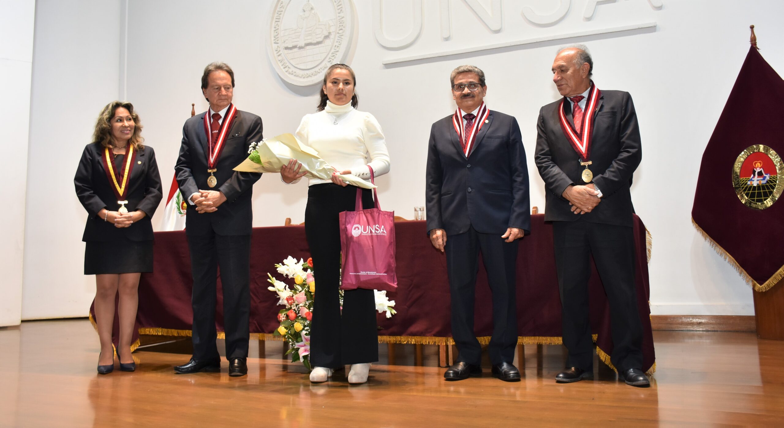 En la Ceremonia de inicio del Año Académico de la Casa Agustina, recibió de manos del Rector, Dr. Hugo Rojas Flores, Vicerrector Académico, Dr. Luis Cuadros Paz, Vicerrector de Investigación, Dr. Henry Polanco Cornejo y Secretaria General, Dra. Ruth Chirinos Lazo, presentes en reconocimiento a su esfuerzo por haber logrado el mayor puntaje de todos los exámenes de Admisión a la UNSA.