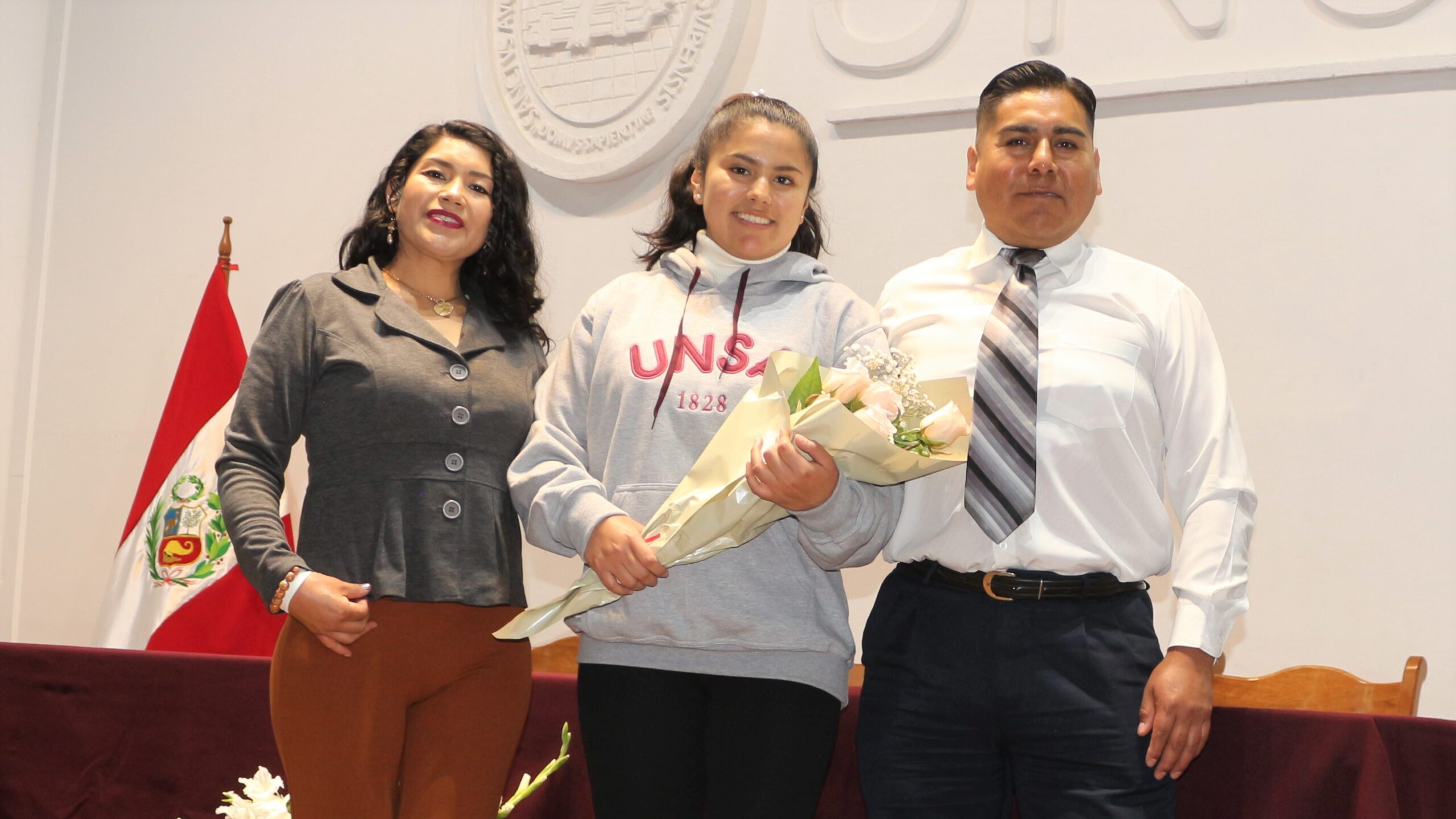 En la Ceremonia de inicio del Año Académico de la Casa Agustina, recibió de manos del Rector, Dr. Hugo Rojas Flores, Vicerrector Académico, Dr. Luis Cuadros Paz, Vicerrector de Investigación, Dr. Henry Polanco Cornejo y Secretaria General, Dra. Ruth Chirinos Lazo, presentes en reconocimiento a su esfuerzo por haber logrado el mayor puntaje de todos los exámenes de Admisión a la UNSA.