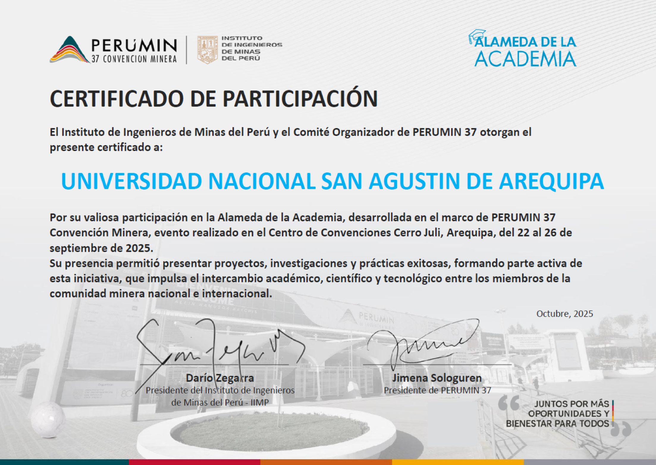 El documento de reconocimiento a la UNSA fue rubricado por Darío Zegarra, Presidente del Instituto de Ingenieros de Minas del Perú – IIMP, y Jimena Sologuren, Presidente de PERUMIN 37, destacando la relevancia de la contribución de la universidad al desarrollo y la innovación en el sector minero.