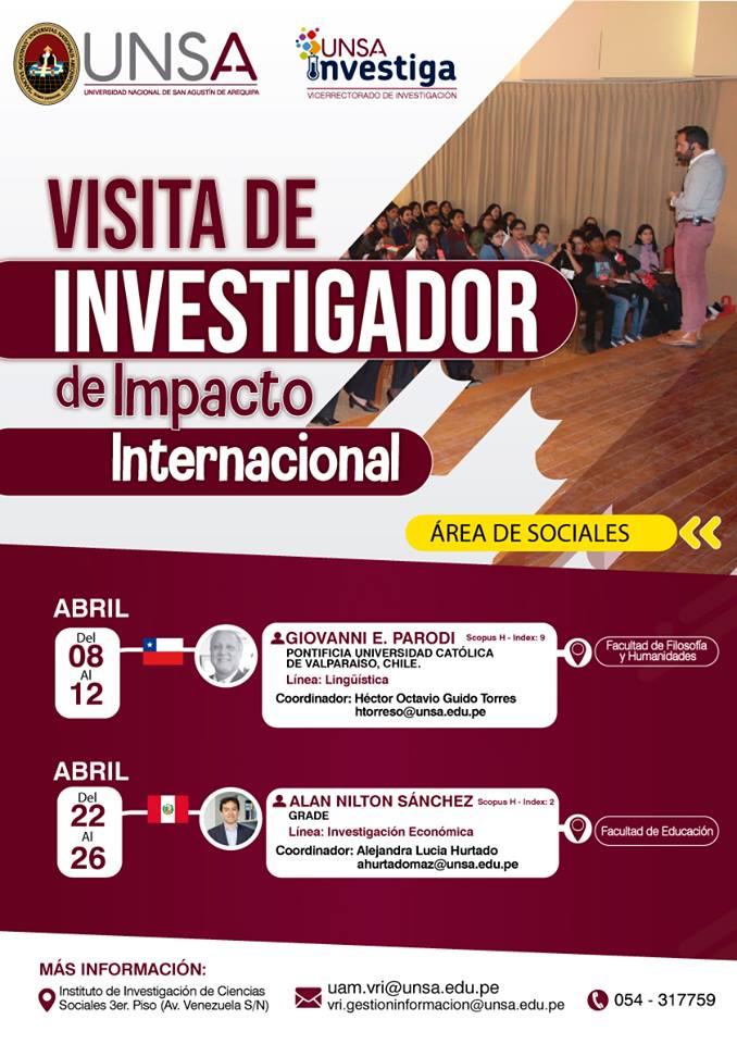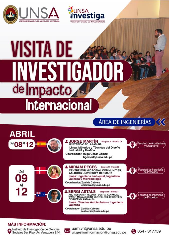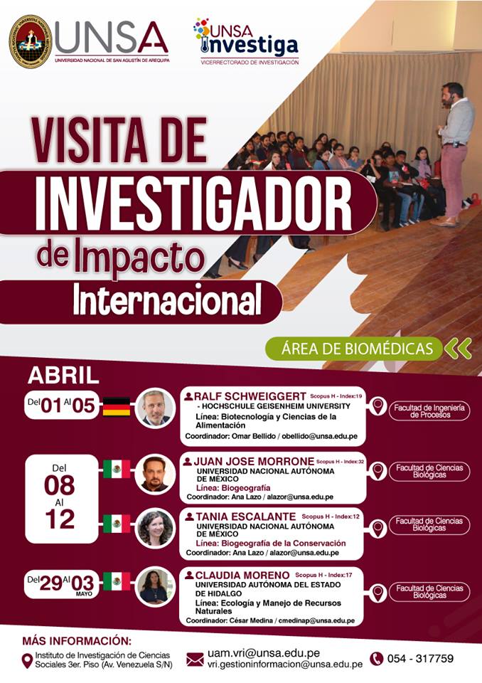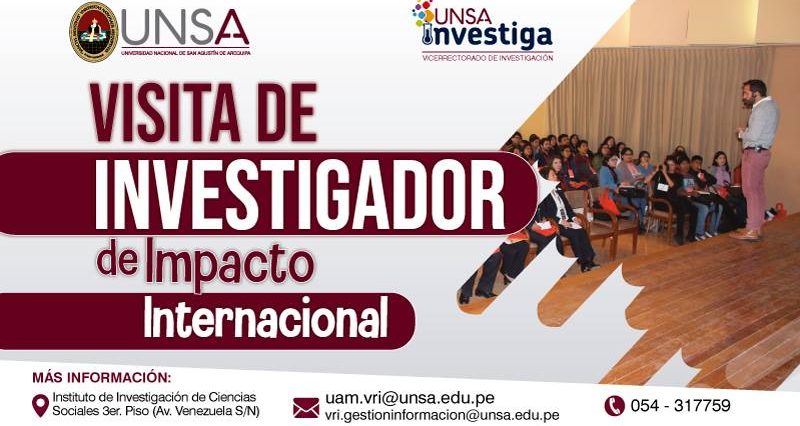La Universidad Nacional de San Agustín a través de UNSA Investiga y el Vicerrectorado de Investigación dan a conocer la visita de investigadores de impacto internacional durante el mes de abril en las tres áreas.