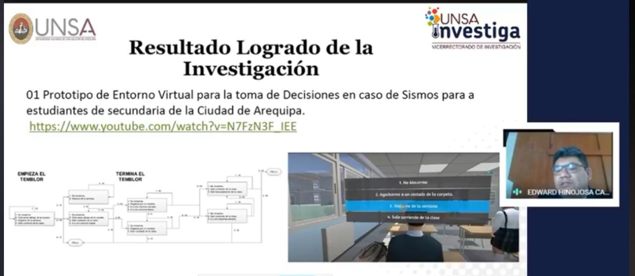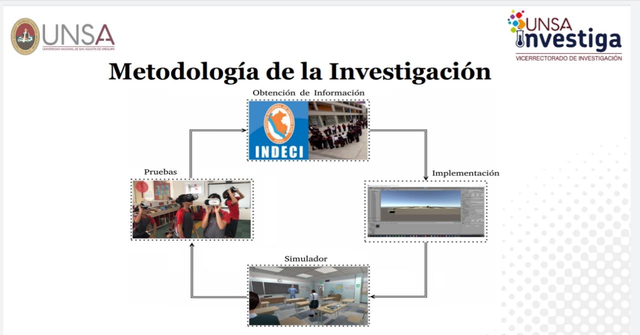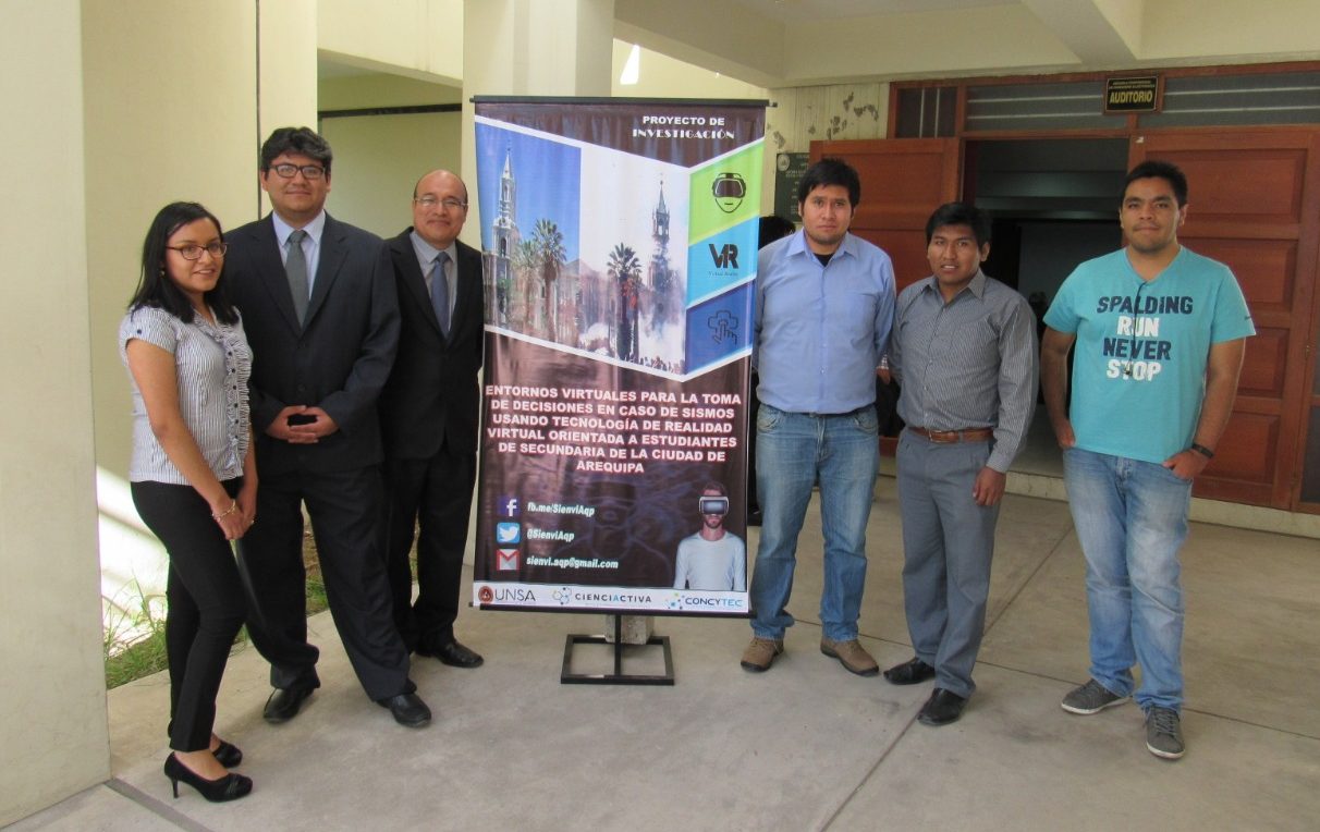 A través del proyecto de investigación “Entornos virtuales para la toma de decisiones en caso de sismos usando tecnología de realidad virtual orientado a estudiantes de secundaria de la ciudad de Arequipa” se creó un aplicativo y visores (conectados a celulares) que trasladan a los estudiantes a un aula virtual, con carpetas, escritorios y alumnos en pleno horario de clases. La simulación de un terremoto de 7 grados demanda que los estudiantes tomen decisiones para afrontarlo; el simulador les brinda diferentes opciones, otorgándoles altos puntajes a las mejores decisiones.