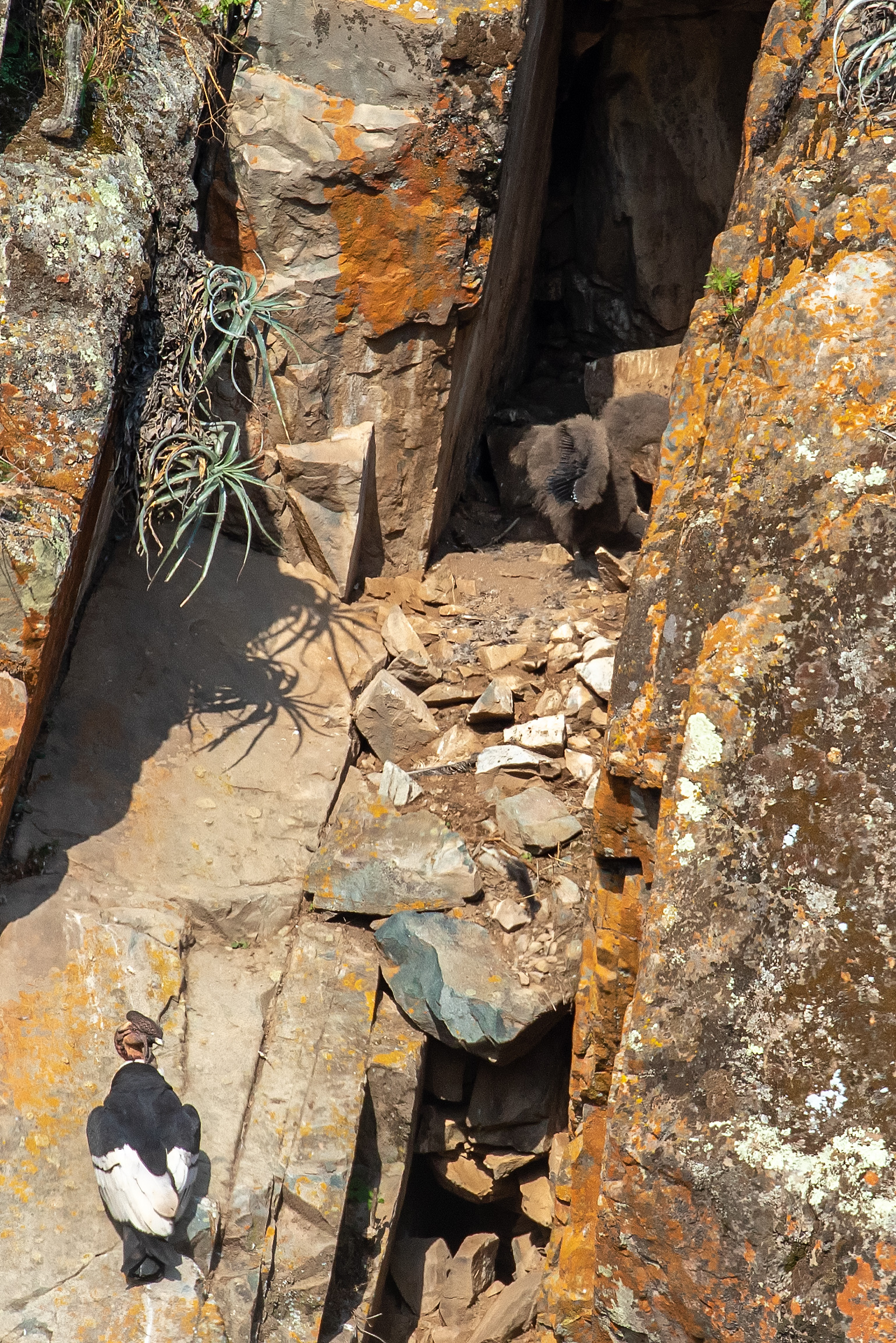 Después de una caminata de 30 minutos llegaron a una quebrada en un cerro empinado. El nido se encontraba en una grieta de rocas, fue avistado en video, para luego permanecer tres días en la zona, tomando fotografías y registros de los cóndores.