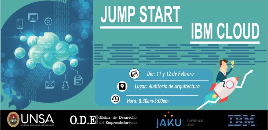 La Universidad Nacional de San Agustín de Arequipa a través de la Incubadora de Empresas – JAKU emprende UNSA, que dirige el Ing. Juan Zamata e IBM, organizan el JUMP START – IBM CLOUD en donde se desarrollarán temas computaciones relevantes en la actualidad y el uso de herramientas en la nube mediante las plataformas IBM.