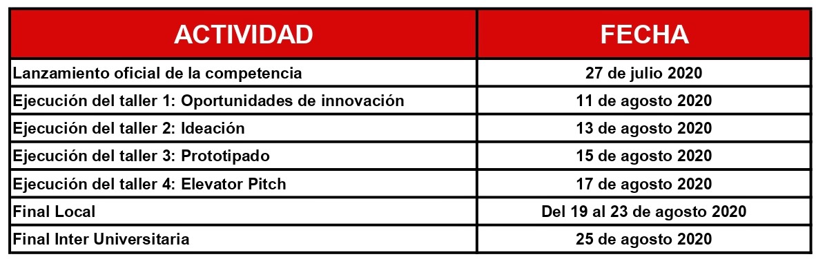 JAKU Emprende UNSA, mediante su equipo técnico y red de mentores será el encargado de preparar a los equipos de la Casa Agustina, que participarán en este concurso, en donde luego de un proceso de preparación serán 02 equipos que representarán a la UNSA en la final interuniversitaria con las distintas Universidades del país, para ello se tiene elaborado el siguiente cronograma de actividades realizadas en conjunto con Equipu: