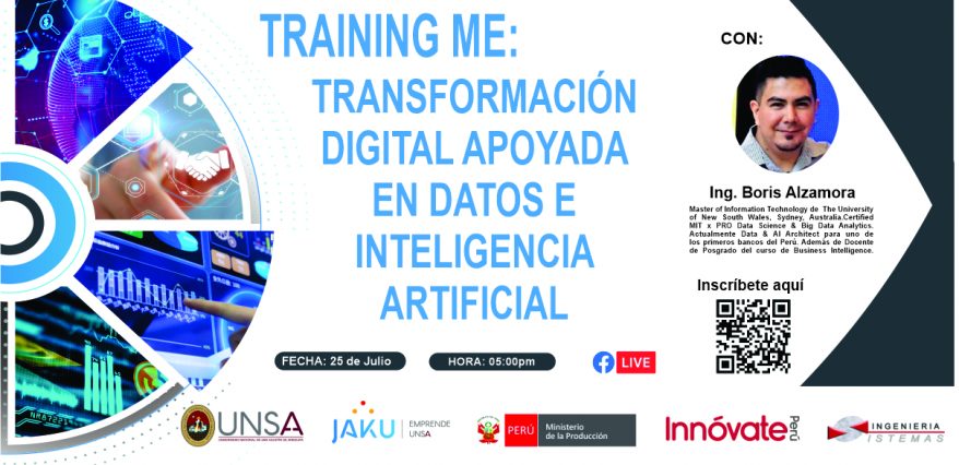 Continuando con su programa TRAINING ME, la oficina de Desarrollo y Emprendedurismo de la Universidad Nacional de San Agustín de Arequipa y su Incubadora JAKU Emprende UNSA, presentan el taller «Transformación Digital Apoyada en Datos e Inteligencia Artificial”, el cual brindará fundamentos clave sobre el uso de datos para una mejor toma de decisiones en todo emprendimiento.