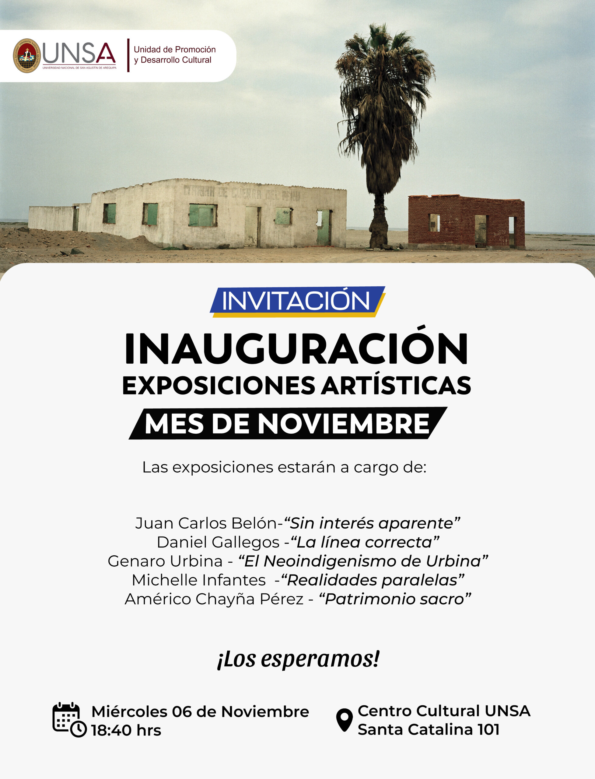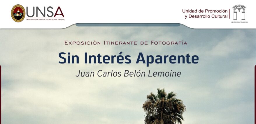 El fotógrafo arequipeño Juan Carlos Belon Lemoine presentará su trabajo fotográfico en el Centro Cultural UNSA (CCUnsa). Esta muestra forma parte de las exposiciones artísticas del mes de noviembre que se realizan en el recinto universitario y que estará disponible al público desde el 6 de noviembre por todo el mes.