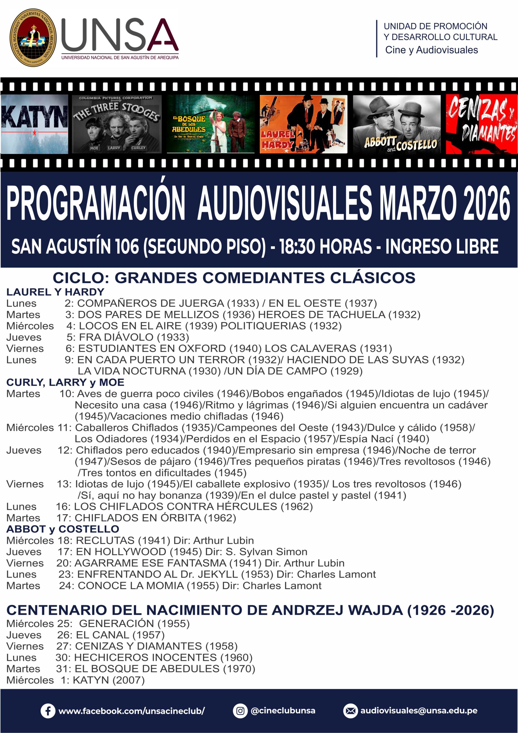 Un espacio de encuentro entre el humor y la reflexión histórica se abren gracias al área de Cine y Audiovisuales de la Universidad Nacional de San Agustín de Arequipa (UNSA), mediante una programación cinematográfica que recupera obras esenciales del cine mundial, orientada a públicos jóvenes que hoy redescubren el valor del séptimo arte como experiencia cultural colectiva.