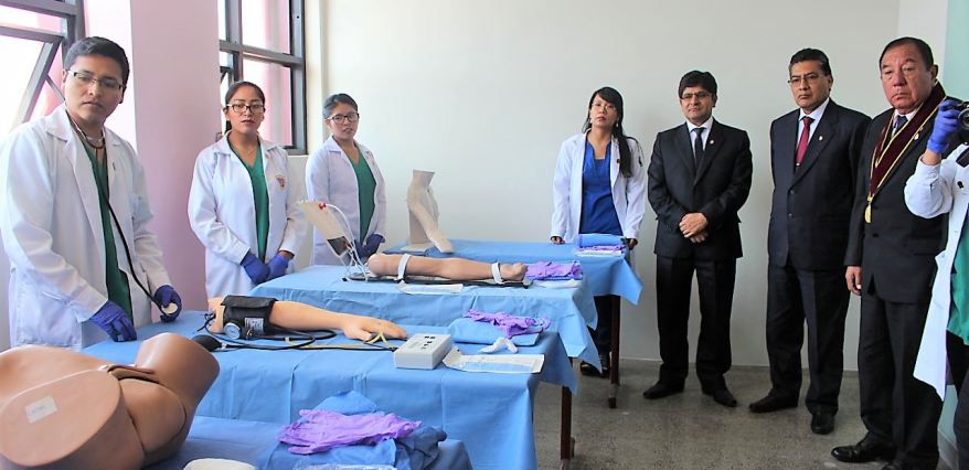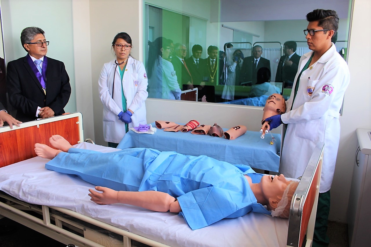 Por su parte el Decano de la Facultad de Medicina Dr. Hugo Rojas Flores, agradeció a las autoridades por el apoyo brindado en la implementación de este moderno centro que los pone a la vanguardia en el uso de este recurso fundamental en el avance de la educación médica, explicó que hay resistencia en los pacientes para la práctica de los estudiantes, por lo que estos simuladores permitirán hacer varias intervenciones como: entubar, tomar la presión, atender partos, paros cardiacos y otras simulaciones como un paciente real. Mencionó además que en este Centro de implantación para la enseñanza médica, se puede realizar investigación; los maniquís pueden ser manipulados para simular cuadros clínicos como arritmias cardiacas, complicaciones de partos entre otros. El Decano anunció que próximamente se inaugurarán los módulos para las mesas de simulación y centro de plastificación de cadáveres para su conservación por tiempo indefinido, además detalló que están a la espera de la llegada de 4 cadáveres importados de EE. UU.