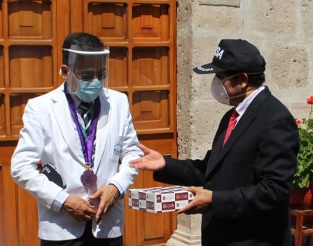 El Dr. Rohel Sánchez Sánchez, rector de la Casa Agustina entregó los equipos de protección a los decanos del Colegio Médico, Dr. Javier Gutiérrez y del Colegio de Enfermeros, Dra. Mayrene Abarca.