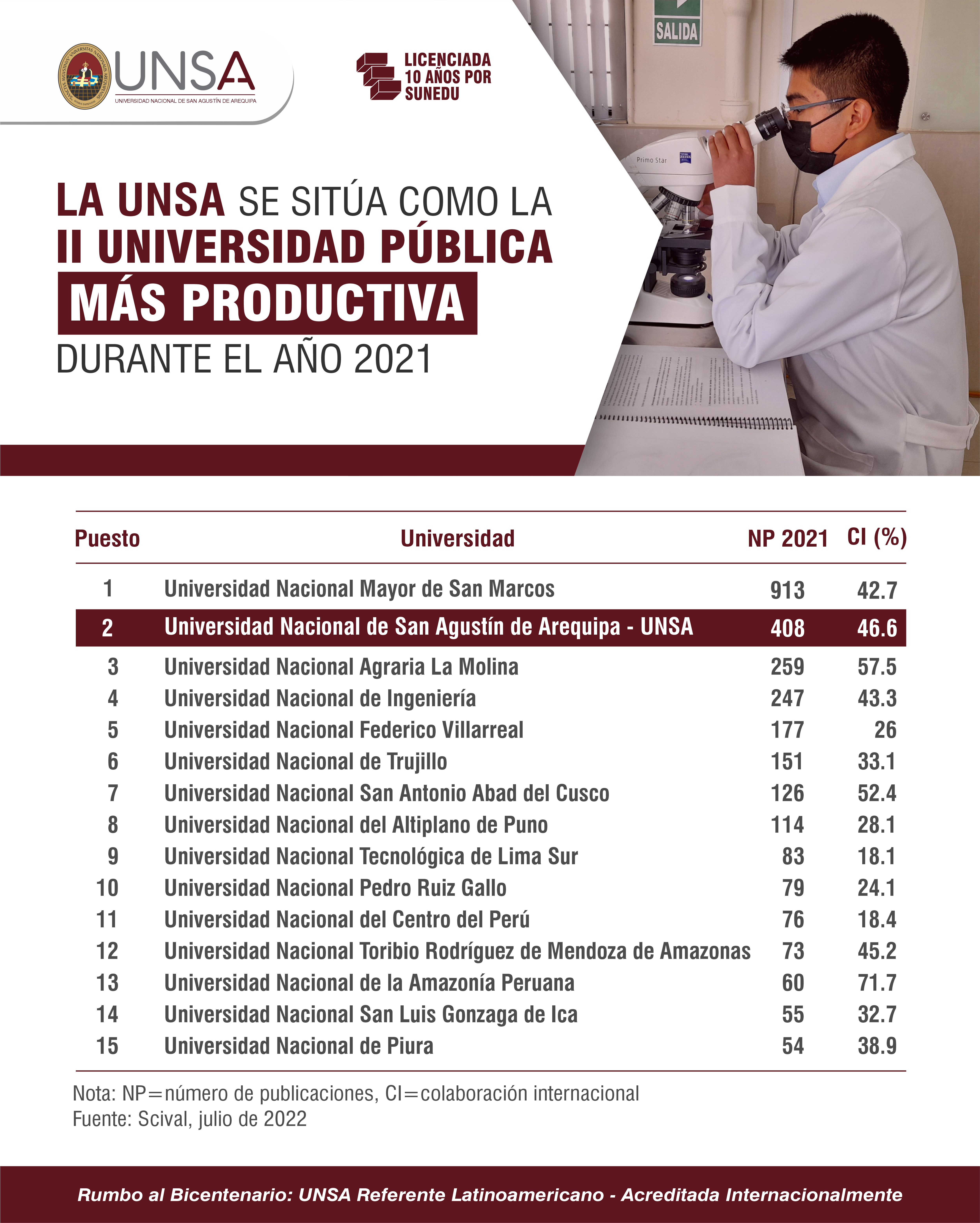 La lista agrupa a 15 universidades públicas peruanas y lo encabeza la Universidad Nacional Mayor de San Marcos. La UNSA, se ubica en el puesto Nro. 2, está por encima de universidades de Lima, Trujillo, Cuzco y Puno, al tener 408 publicaciones científicas en revistas indexadas, de las cuales el 46.6% cuenta con colaboración internacional.