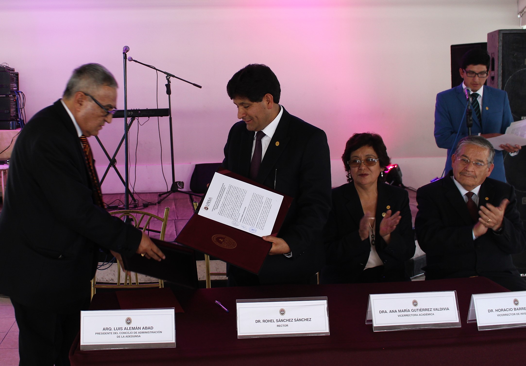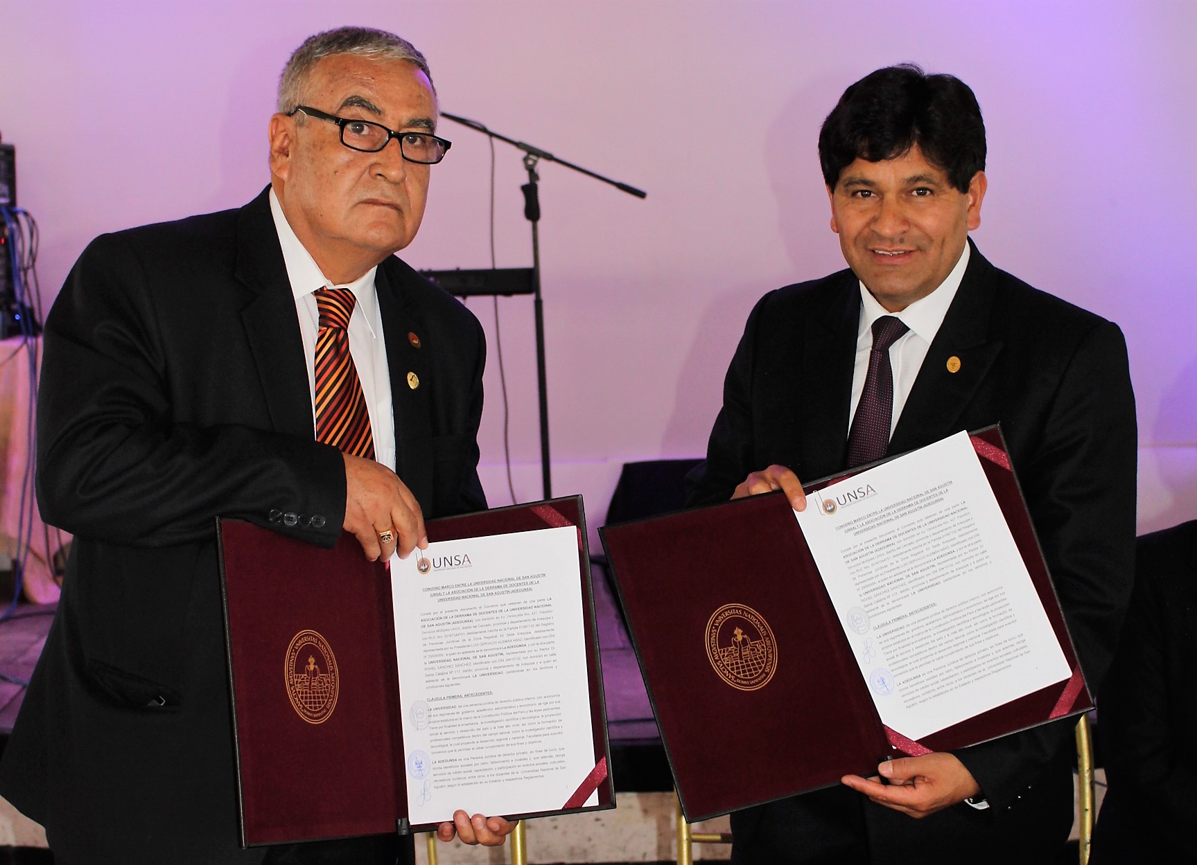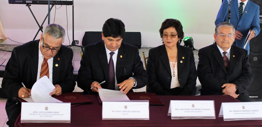 Suscribieron este convenio, el Dr. Rohel Sánchez Sánchez, Rector de la UNSA y el Arq. Luis Alemán Abad, Presidente de la ADEDUNSA, como parte de la ceremonia por el 28° aniversario de creación de esta asociación que congrega a casi mil docentes agustinos.