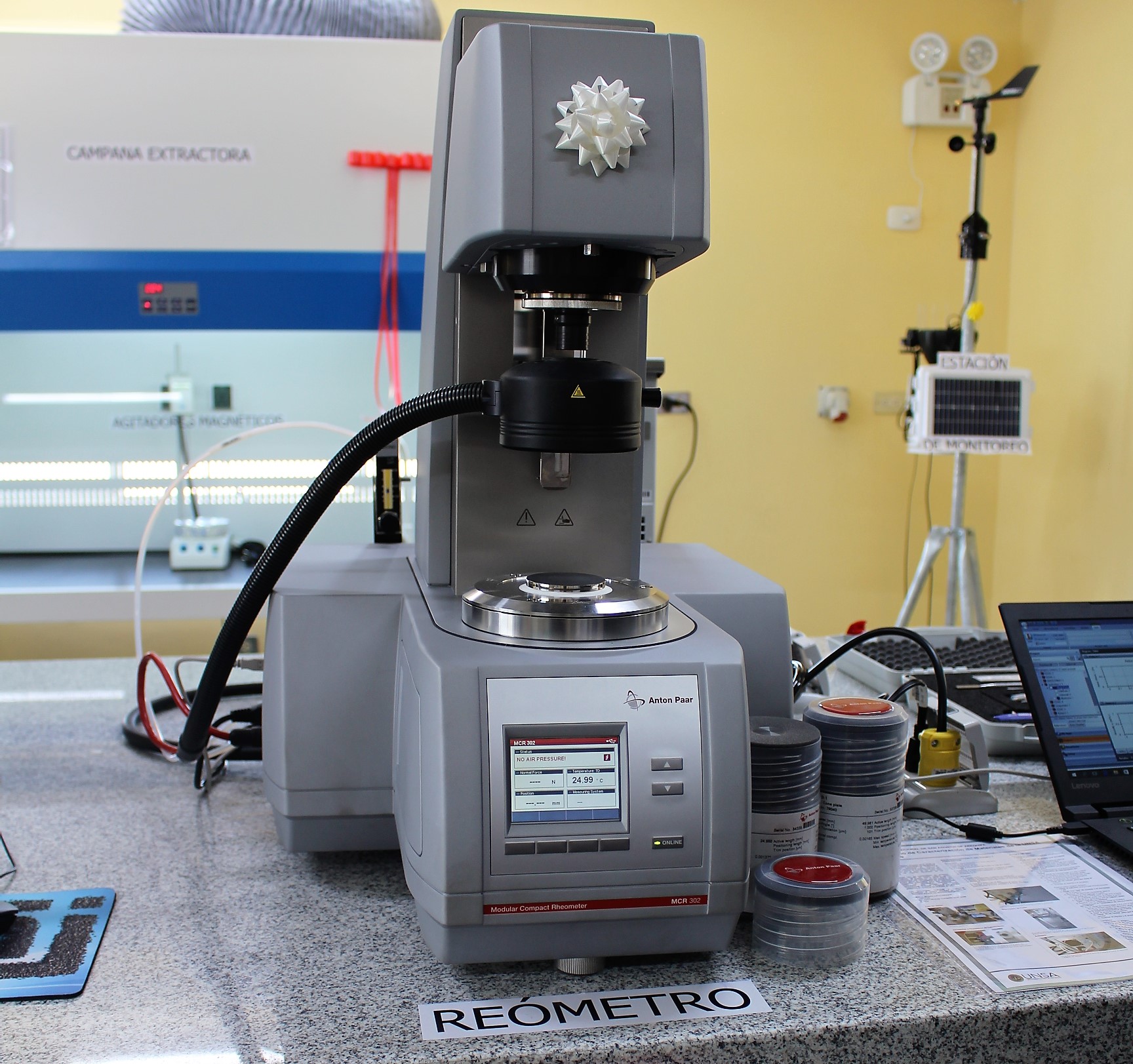 Reómetro: Mide las propiedades reólogicas de los fluidos tanto en esfuerzo como en deformación controlada. Desde la temperatura ambiente hasta 250 °C. Procedencia Australia.