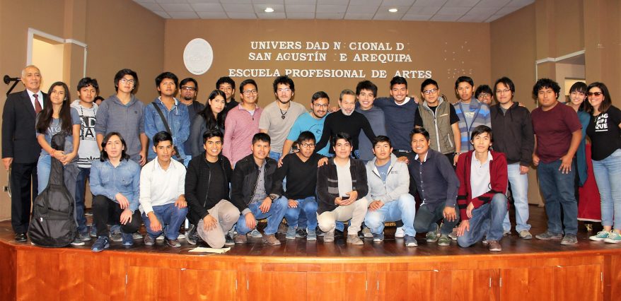 Este encuentro que tuvo lugar en el auditorio de la Escuela Profesional de Artes de la UNSA, contó con la participación de su director Dr. Hugo Cueto Velásquez, los profesores de guitarra, Lic. Carlos Fernández Suarez y Lic. Alejandro Dávila Ballón, el Maestro Jorge Herrera Santander, Profesor invitado de guitarra; docentes y estudiantes de esta carrera profesional.