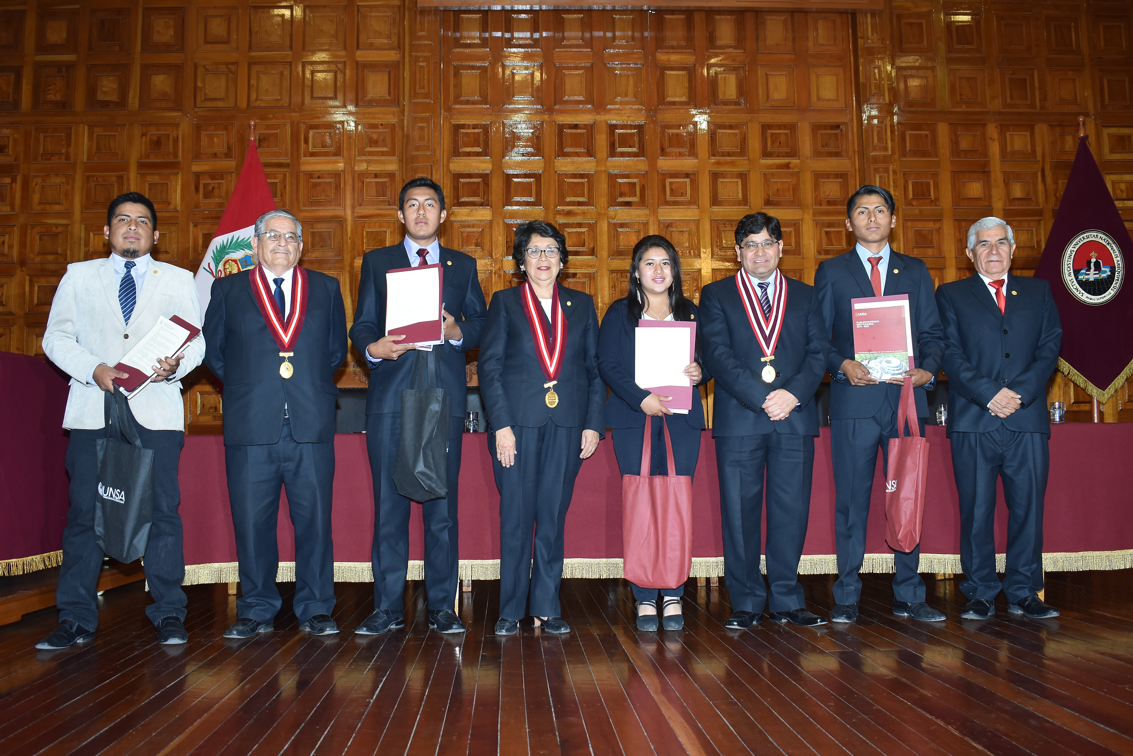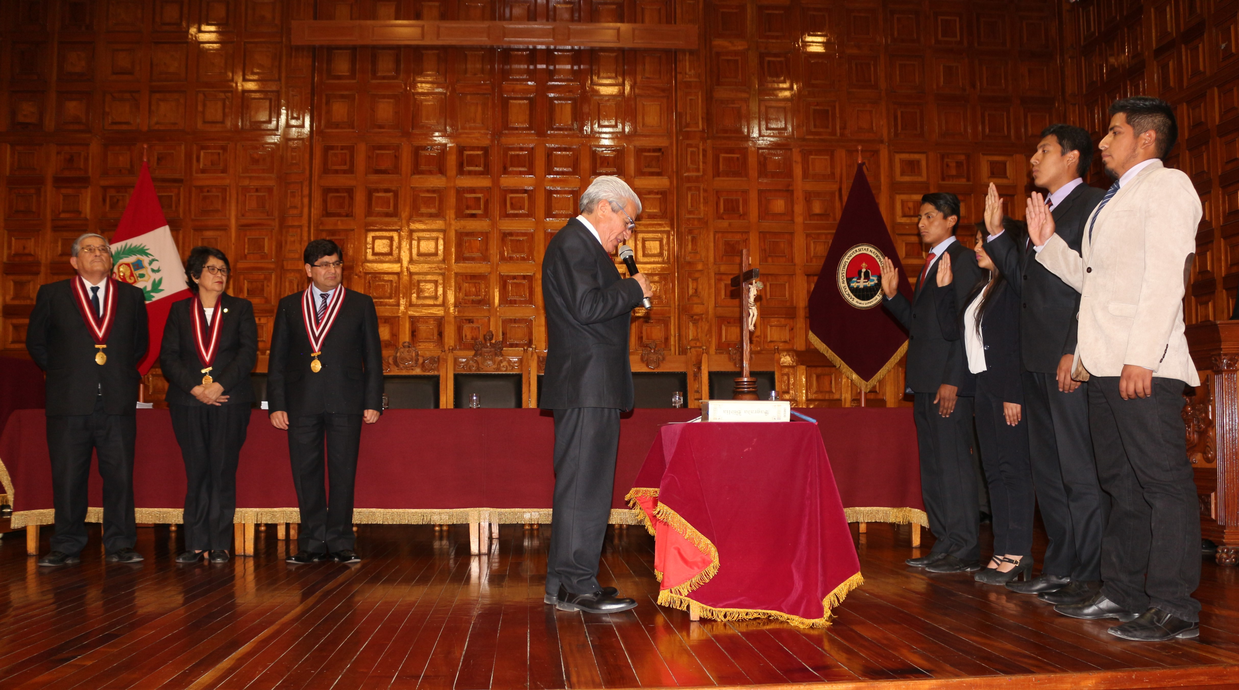 Los estudiantes Rolando Ochochoque Huamanga, Cynthia Shirley Vilca Chire, William Zamudio Quiñonez y Junior Jankovic Chávez Pacherre asumieron el cargo en el Paraninfo Arequipa. El Rector, Dr. Rohel Sánchez Sánchez, la Vicerrectora Académica Dra. Ana María Gutiérrez Valdivia y el Vicerrector de Investigación Dr. Horacio Barreda Tamayo, les entregaron el estatuto universitario, el plan estratégico institucional y el modelo educativo UNSA.