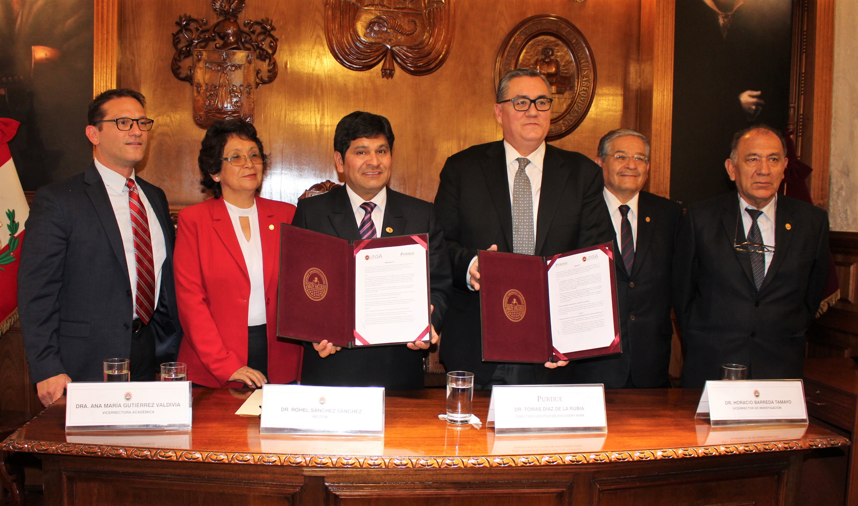 El Dr. Rohel Sánchez Sánchez, Rector de la casa agustina y el PhD. Tomás Díaz de la Rubia, Presidente Ejecutivo del Discovery Park y Vicepresidente de Purdue, firmaron la Adenda 3 al acuerdo de  Cooperación Interinstitucional entre estas universidades, que aprueba la segunda etapa del plan de proyectos de investigación cuyo objetivo principal es el constante aporte científico para la toma de decisiones, estudios y monitoreo destinado a impulsar el desarrollo sostenible de Arequipa.