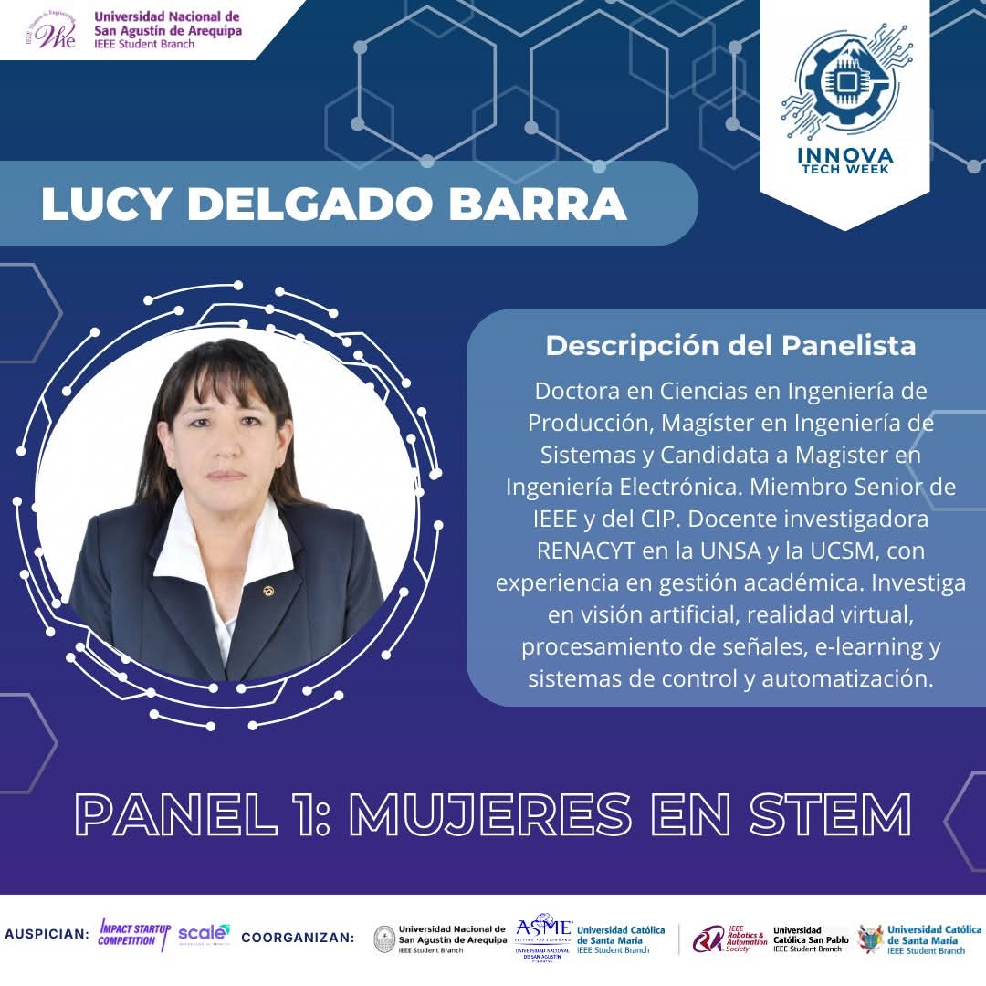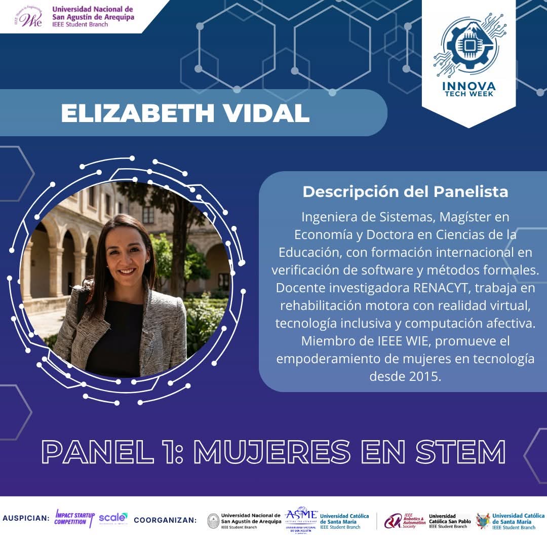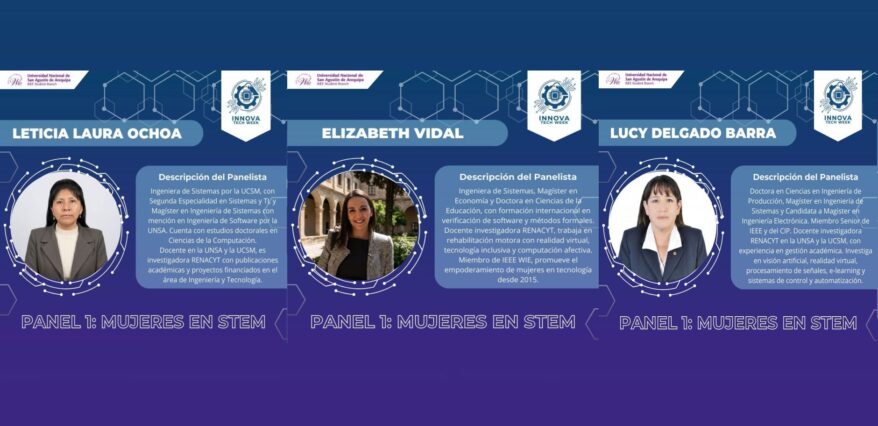 Las tres ponentes, todas profesoras de la Escuela Profesional de Ingeniería de Sistemas de la casa agustina, son referentes en sus áreas. Elizabeth Vidal, doctora en Ciencias de la Educación, investigadora RENACYT y miembro de IEEE WIE, trabaja en rehabilitación motora con realidad virtual y tecnología inclusiva. Leticia Laura Ochoa, magíster en Ingeniería de Software y también investigadora RENACYT, imparte clases en la UNSA y la UCSM con proyectos financiados en su campo. Por su parte, Lucy Delgado Barra, doctora en Ingeniería de Producción y miembro senior de IEEE, se dedica a la investigación en visión artificial, realidad virtual y sistemas de control.
