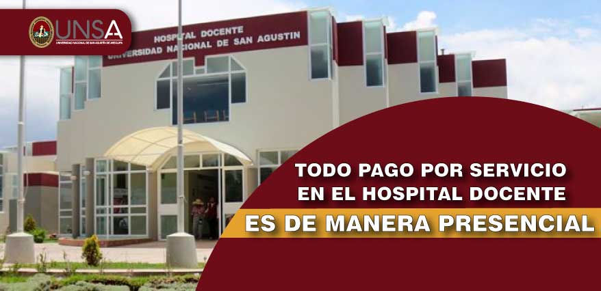 Los pagos por los servicios de salud del Hospital Docente de la Universidad Nacional de San Agustín de Arequipa (UNSA) se realizan de manera presencial en su local de la Av. Aeropuerto N°504 P. J. Víctor Andrés Belaunde, distrito de Cerro Colorado. Ya sea por atenciones no Covid en Medicina General y 6 especialidades, la planta de oxígeno, los laboratorios de análisis molecular y las pruebas rápidas de descarte del Sarz Cov 2; ningún pago es virtual.