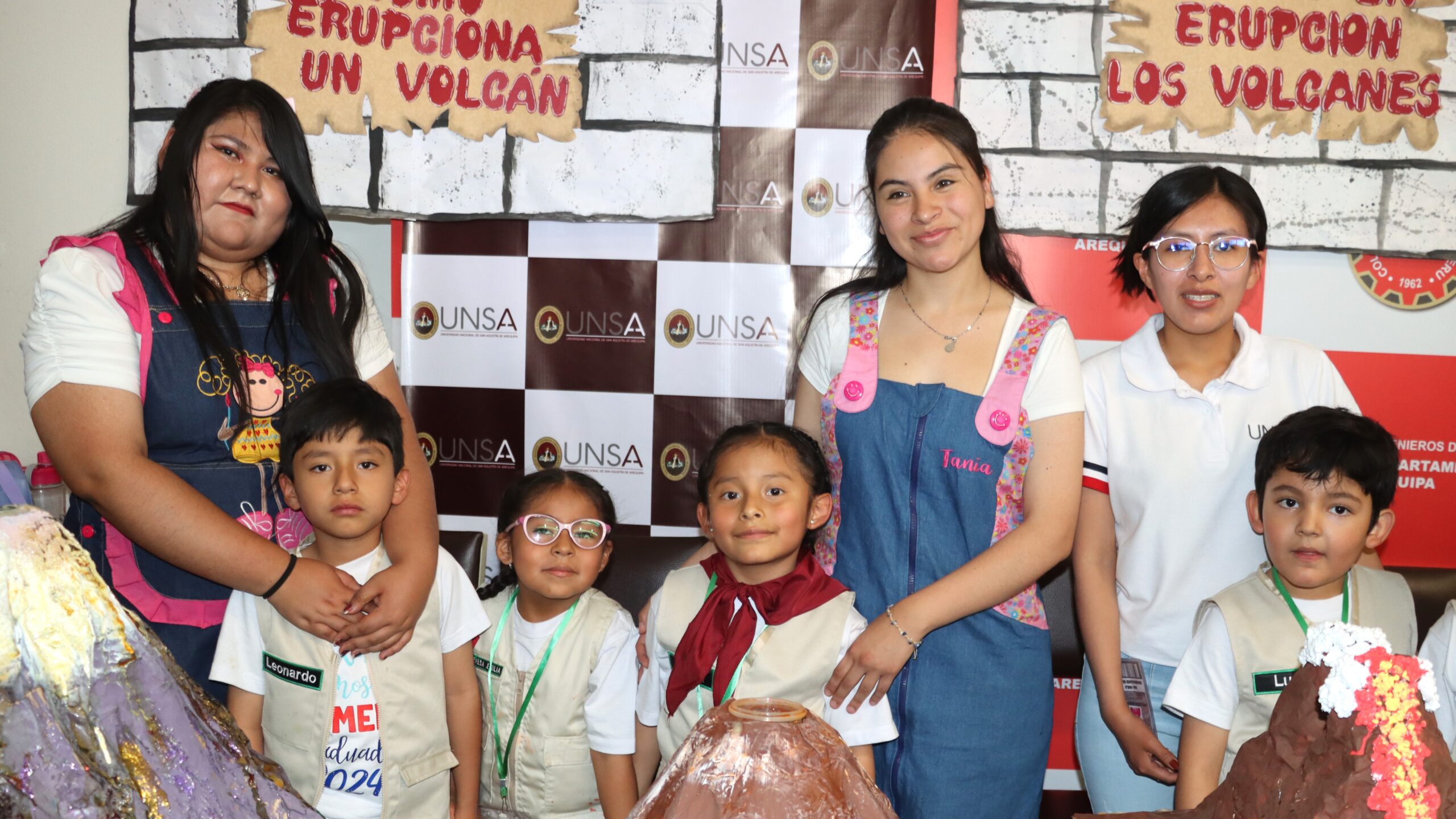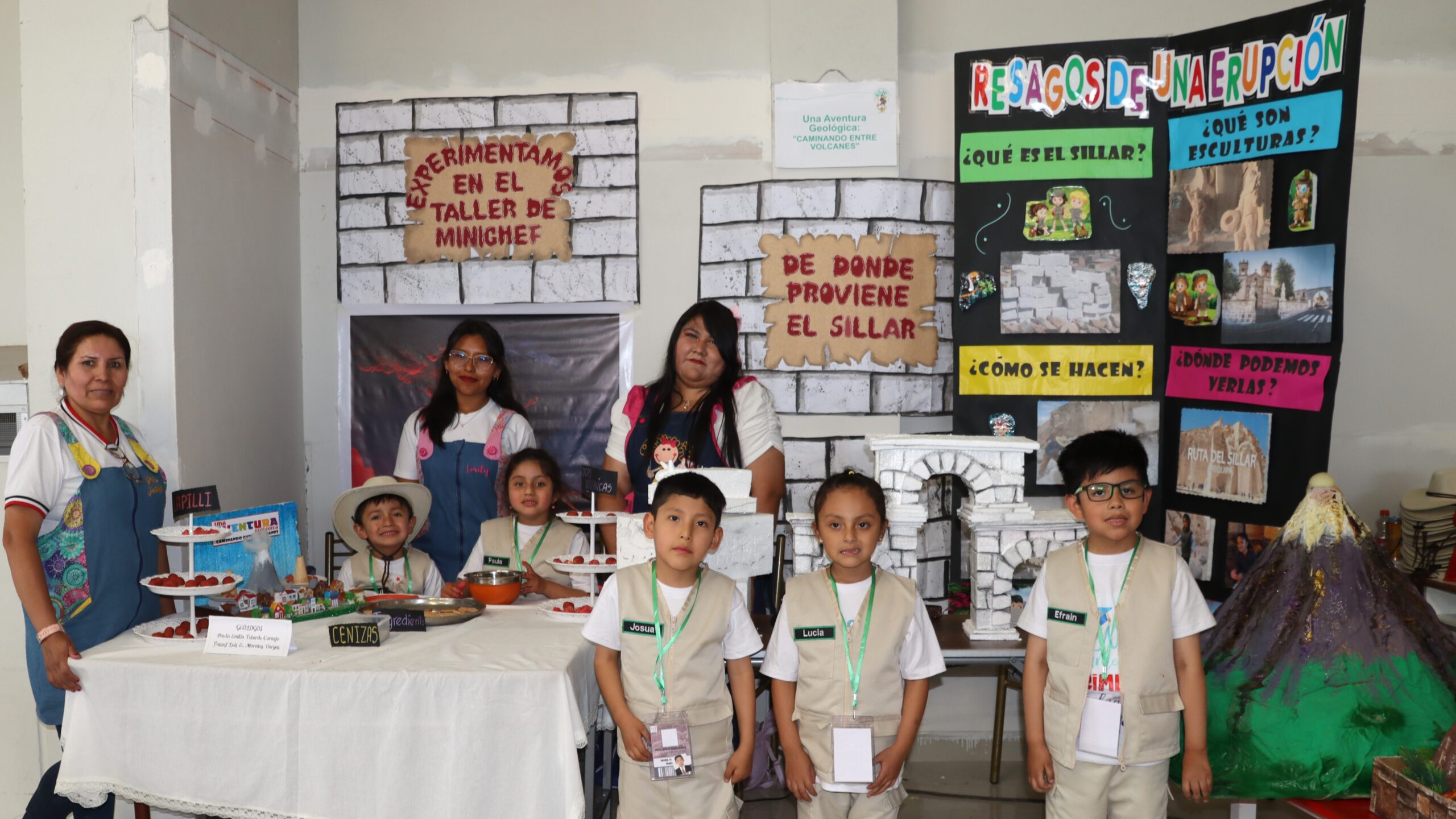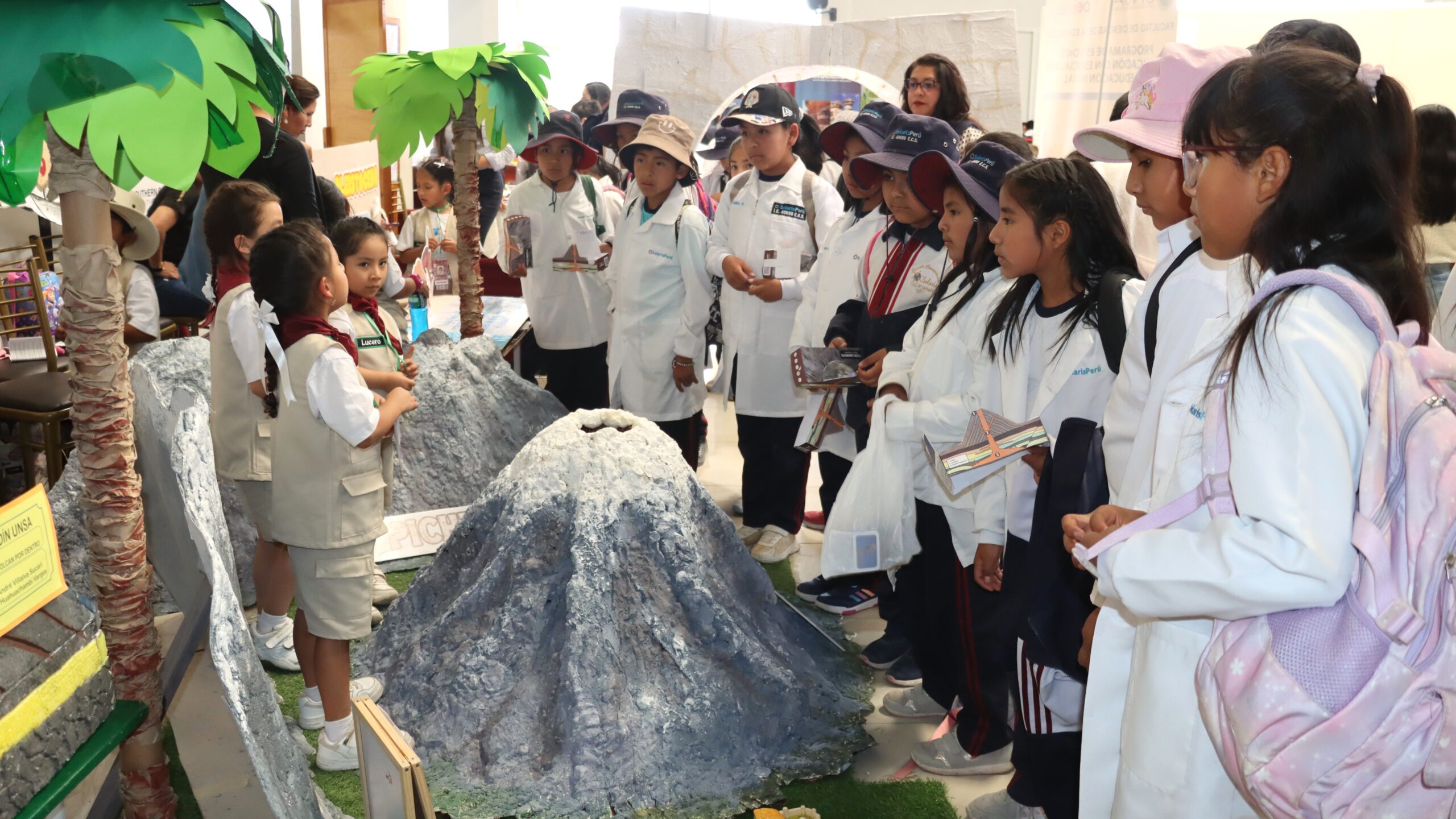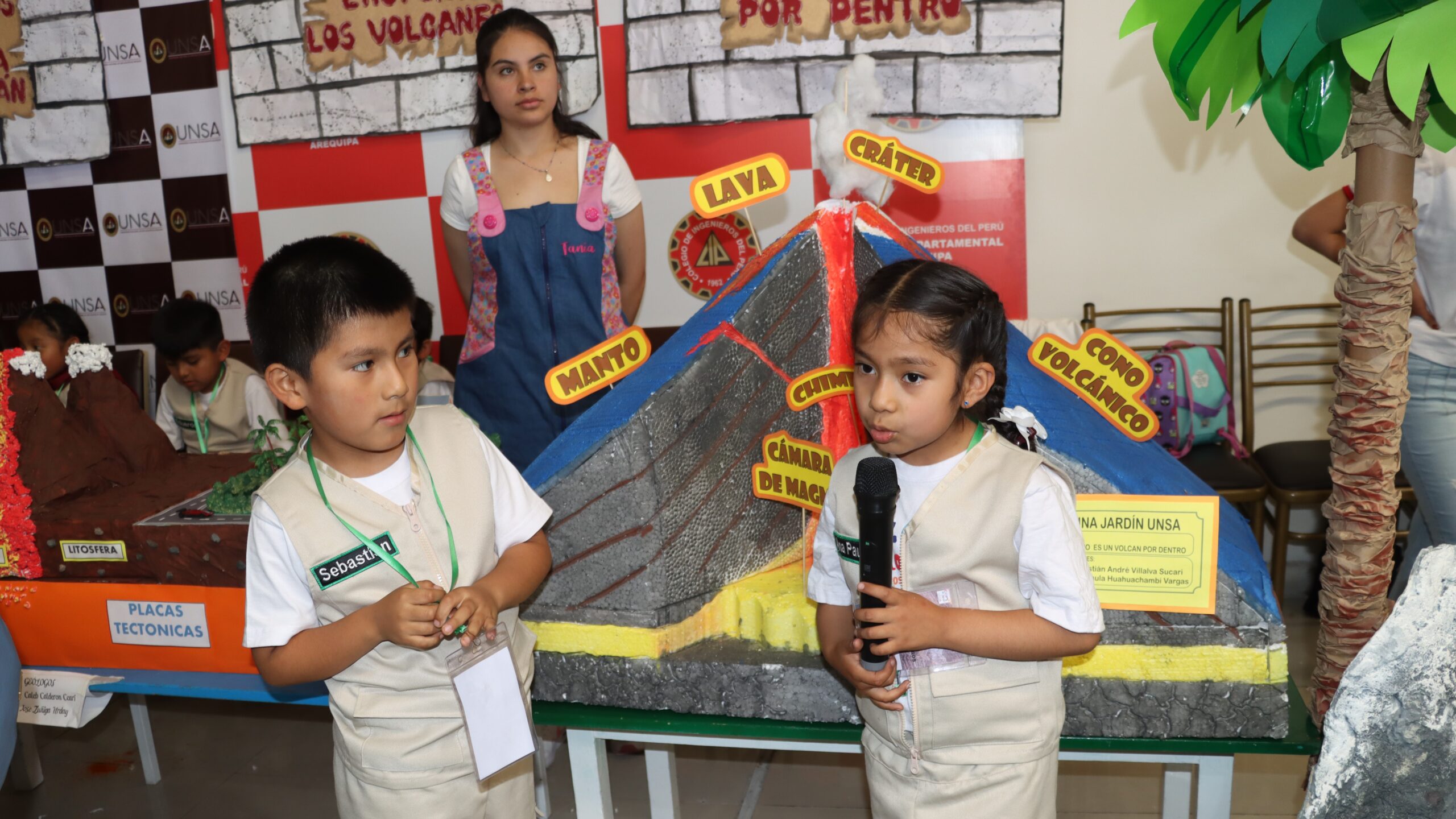 Un grupo de 20 niños de cinco años de la Cuna Jardín de la Universidad Nacional de San Agustín de Arequipa (UNSA) muestran a los asistentes en la feria científica de las Jornadas de Investigación y Recreación en Geología, celebrada en el Colegio de Ingenieros, con su innovador proyecto titulado «Placas Tectónicas: Una Aventura Geológica – Caminando entre Volcanes».