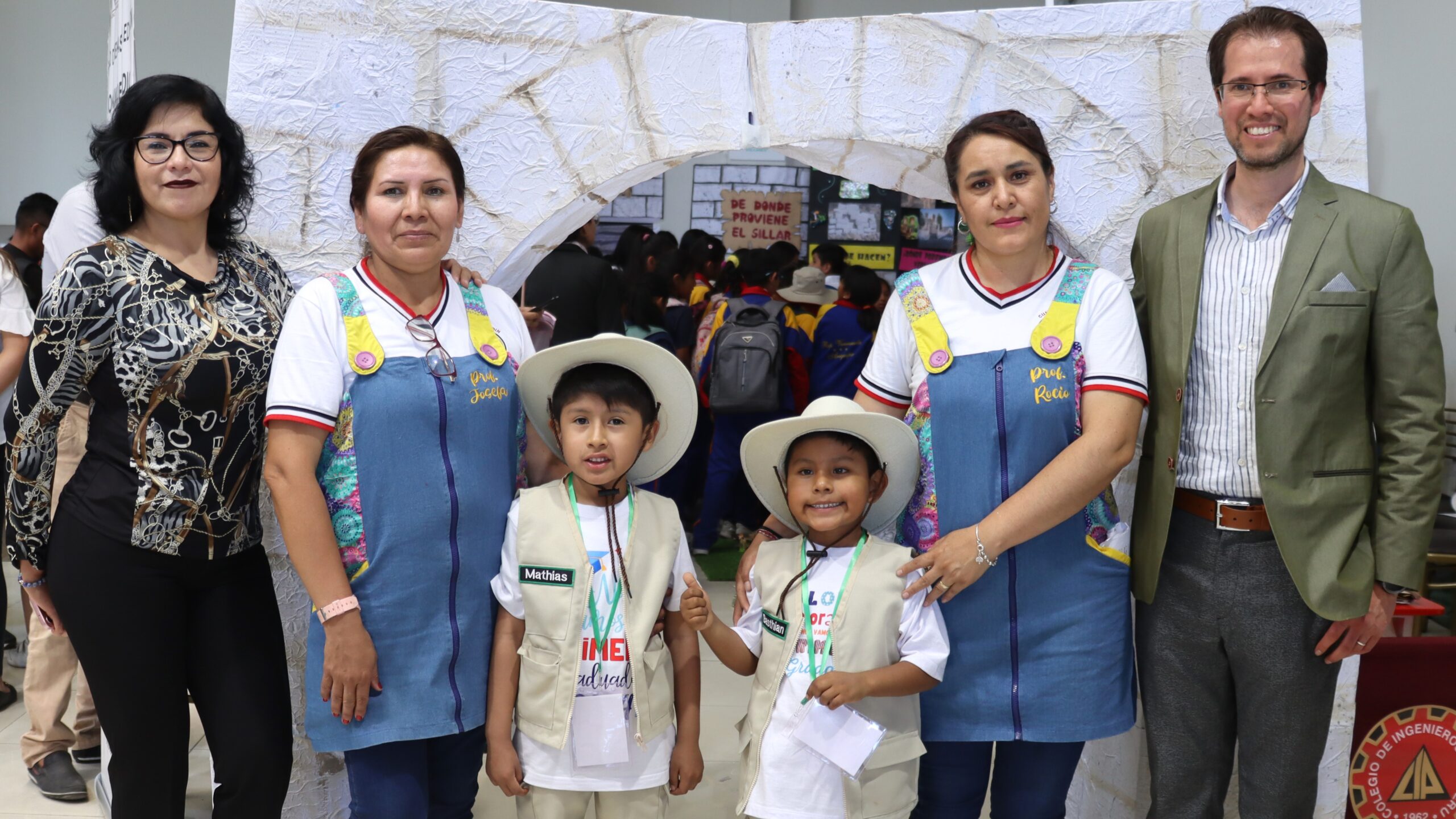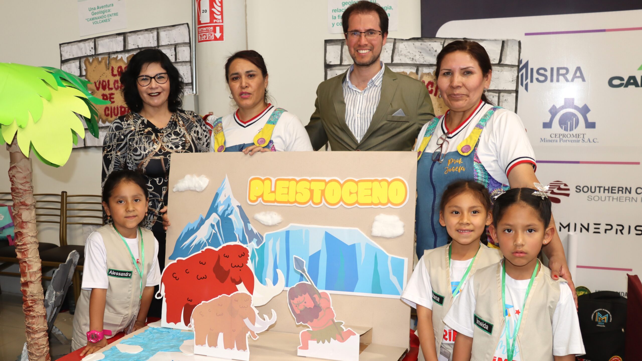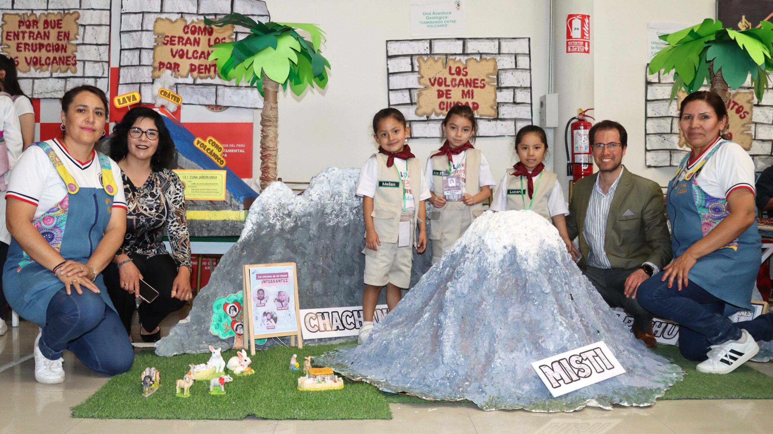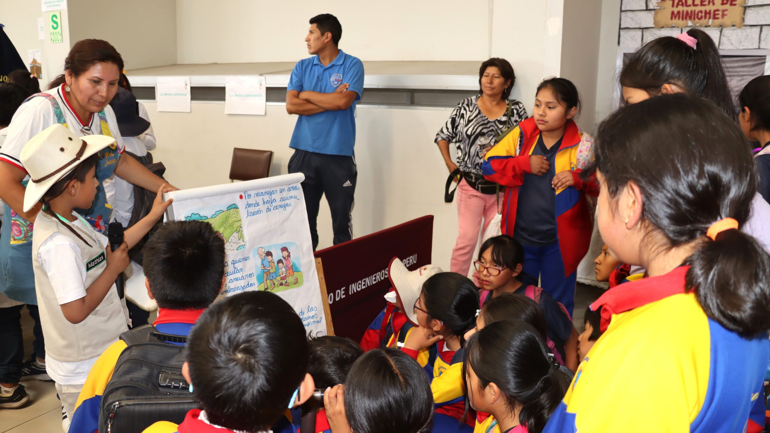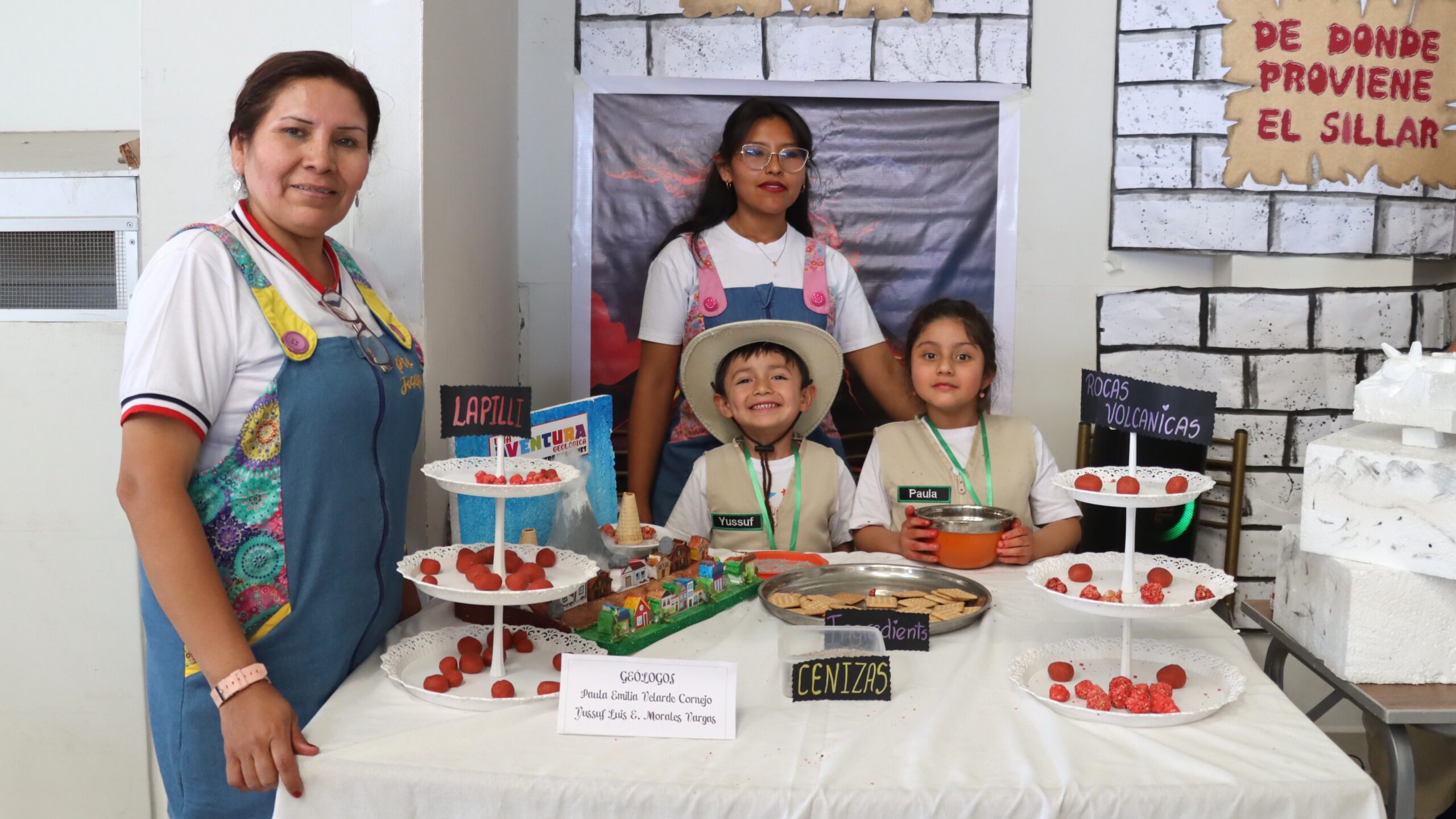 Un grupo de 20 niños de cinco años de la Cuna Jardín de la Universidad Nacional de San Agustín de Arequipa (UNSA) muestran a los asistentes en la feria científica de las Jornadas de Investigación y Recreación en Geología, celebrada en el Colegio de Ingenieros, con su innovador proyecto titulado «Placas Tectónicas: Una Aventura Geológica – Caminando entre Volcanes».